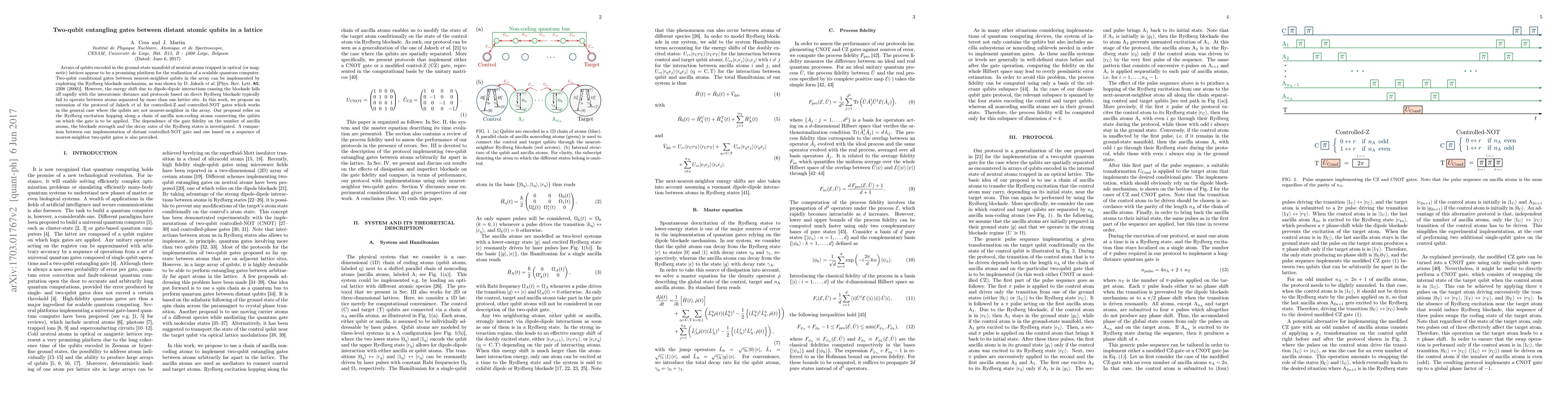 This paper proposes an extended protocol for implementing two-qubit entangling gates between distant atomic qubits in a lattice, overcoming the limitations of direct Rydberg blockade. The method utilizes Rydberg excitation hopping through ancilla atoms to achieve controlled-Z and controlled-NOT gates over larger distances, analyzing the fidelity dependence on various factors and comparing it to nearest-neighbor gate sequences.
