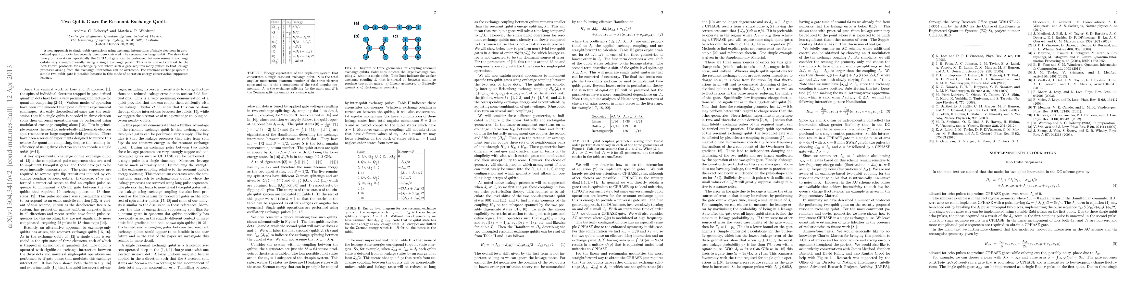 The research demonstrates the implementation of two-qubit gates, specifically the CPHASE gate, on resonant exchange qubits using a single exchange pulse. This is achieved by leveraging energy conservation that suppresses leakage processes, contrasting with previous protocols requiring multiple pulses.
