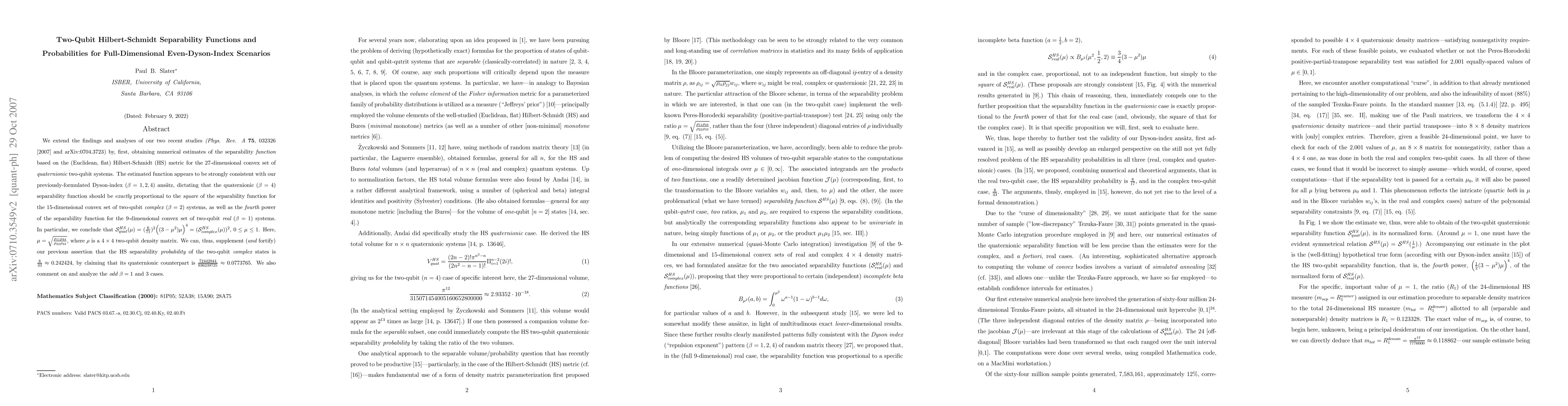 We extend the findings and analyses of our two recent studies (Phys. Rev. A, 75, 032326 [2007] and arXiv:0704.3723) by, first, obtaining numerical estimates of the separability function based on the (Euclidean, flat) Hilbert-Schmidt (HS) metric for the 27-dimensional convex set of quaternionic two-qubit systems. The estimated function appears to be strongly consistent with our previously-formulated Dyson-index (beta = 1, 2, 4) ansatz, dictating that the quaternionic (beta=4) separability function should be exactly proportional to the square of the separability function for the 15-dimensional convex set of two-qubit complex (beta=2) systems, as well as the fourth power of the separability function for the 9-dimensional convex set of two-qubit real (beta=1) systems. In particular, we conclude that S_{quat}(mu) =(6/71)^2 ((3-mu^2) mu)^4 =(S_{complex}(mu))^2. Here, mu =(rho_{11} rho_{44}/(rho_{22} rho_{33})^(1/2), where rho is a 4 x 4 two-qubit density matrix. We can, thus, supplement (and fortify) our previous assertion that the HS separability probability of the two-qubit complex states is 8/33= 0.242424, by claiming that its quaternionic counterpart is 72442944/936239725 = 0.0773765. We also comment on and analyze the odd beta=1 and 3 cases.