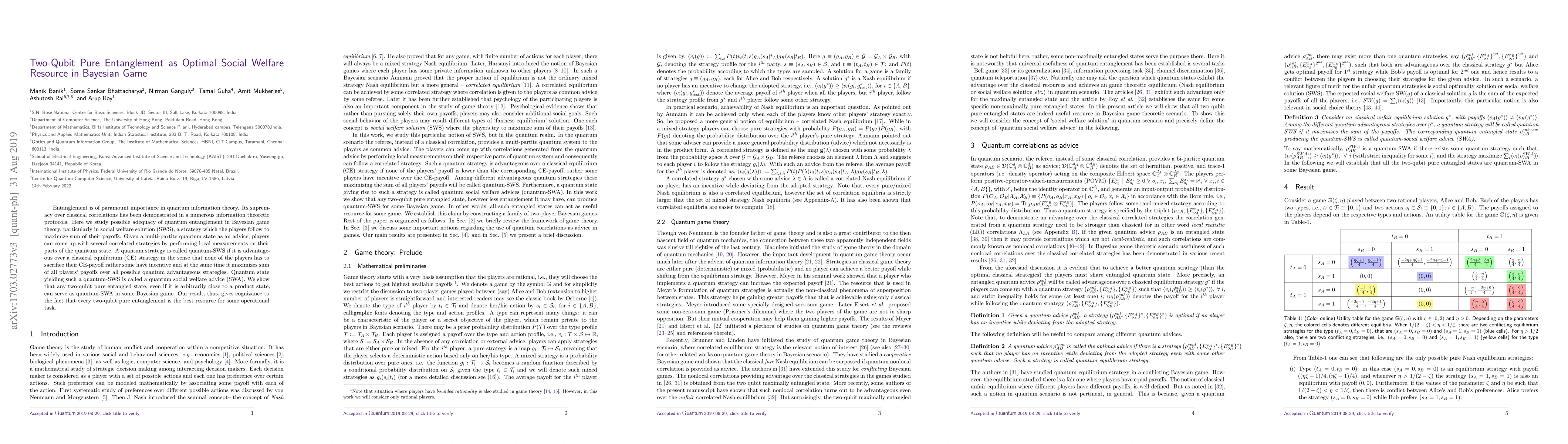 Entanglement is of paramount importance in quantum information theory. Its supremacy over classical correlations has been demonstrated in numerous information theoretic protocols. Here we study possible adequacy of quantum entanglement in Bayesian game theory, particularly in social welfare solution (SWS), a strategy which the players follow to maximize the sum of their payoffs. Given a multi-partite quantum state as an advice, players can come up with several correlated strategies by performing local measurements on their parts of the quantum state. A quantum strategy is called quantum-SWS if it is advantageous over a classical equilibrium (CE) strategy in the sense that none of the players has to sacrifice their CE-payoff rather some have incentive and at the same time it maximizes the sum of all players' payoffs over all possible quantum advantageous strategies. Quantum state yielding such a quantum-SWS is called a quantum social welfare advice (SWA). We show that any two-qubit pure entangled state, even if it is arbitrarily close to a product state, can serve as quantum-SWA in some Bayesian game. Our result, thus, gives cognizance to the fact that every two-qubit pure entanglement is the best resource for some operational task.