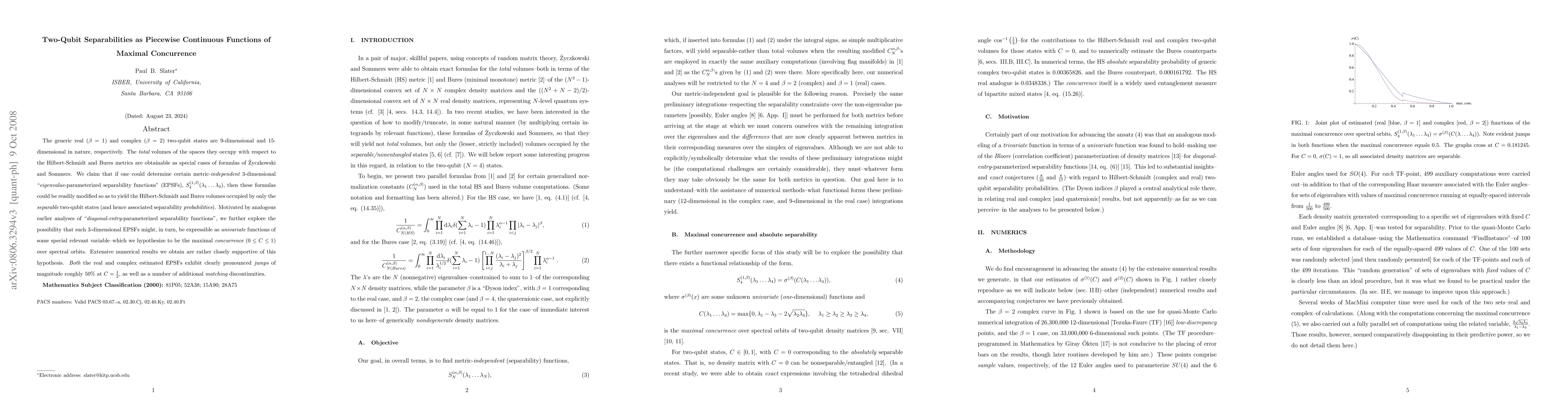 This paper investigates the separability of two-qubit states as functions of maximal concurrence, proposing that separability can be described by 3-dimensional "eigenvalue-parameterized separability functions" (EPSFs). Numerical results suggest that these EPSFs exhibit significant jumps at C=1/2 and other discontinuities, supporting the hypothesis that maximal concurrence is a key variable in determining separability.