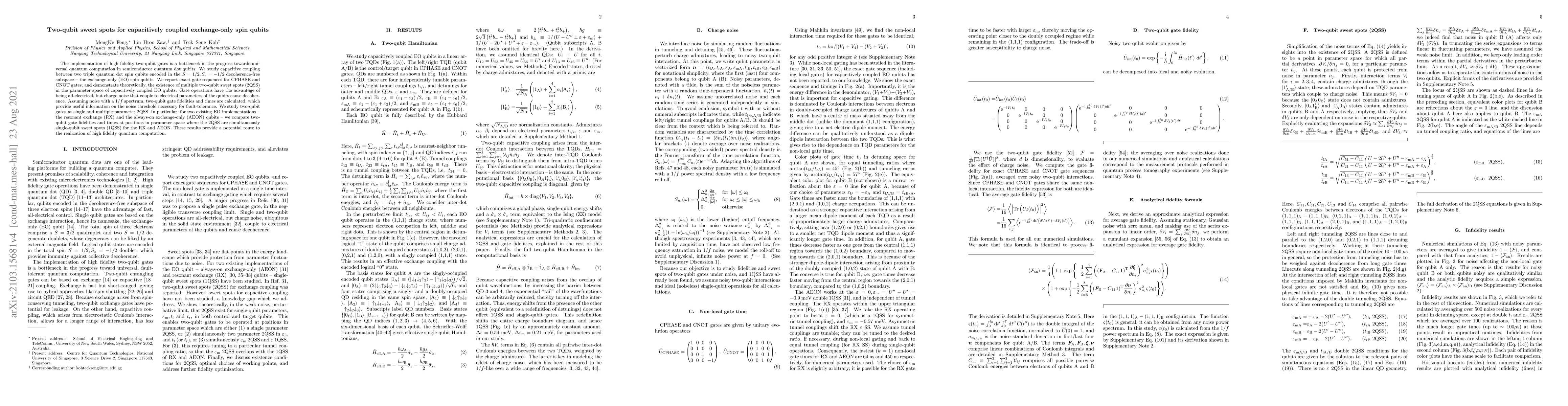 This paper investigates capacitive coupling between exchange-only spin qubits in semiconductor quantum dots, identifying multiple two-qubit sweet spots (2QSS) where gate operations achieve optimal fidelity. The study provides theoretical gate sequences for CPHASE and CNOT gates, and evaluates the impact of charge noise on gate fidelity and time, offering insights into noise thresholds for fault-tolerant quantum computation.
