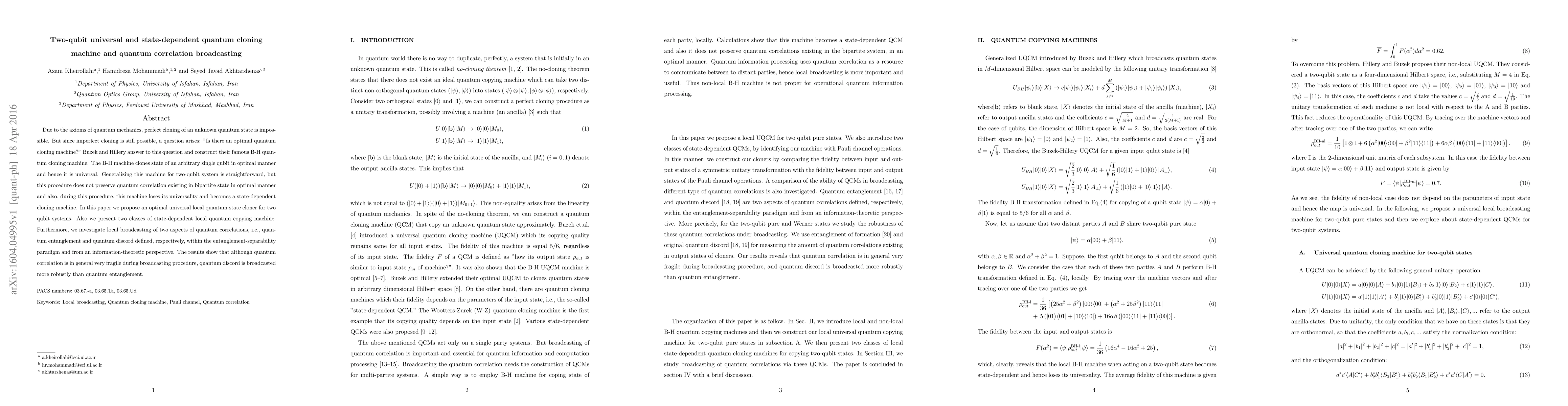 This paper proposes an optimal universal local quantum state cloner for two-qubit systems, addressing the loss of quantum correlation and universality in previous cloning machines. It also explores the local broadcasting of quantum correlations, finding that quantum discord is more robustly broadcasted compared to quantum entanglement.