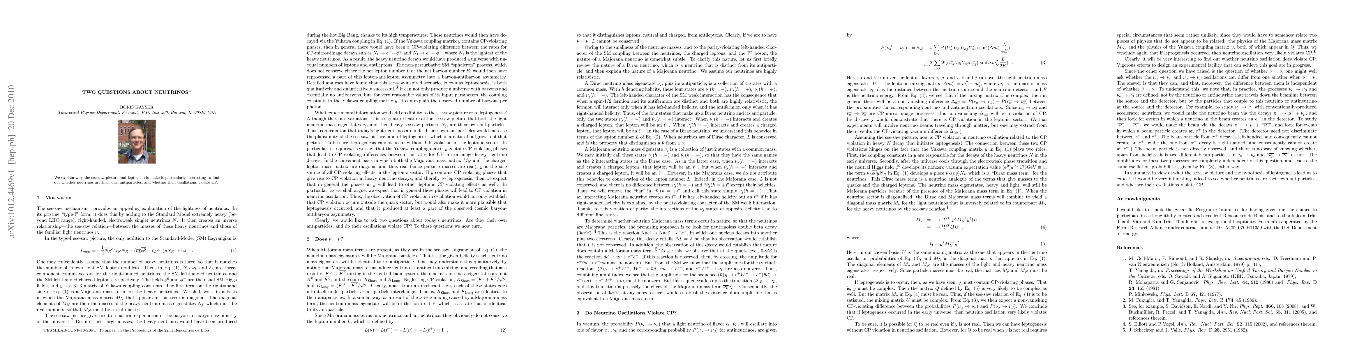 Summary: This paper explores the significance of determining if neutrinos are Majorana particles and if their oscillations break CP symmetry, linking these questions to the see-saw mechanism and leptogenesis in particle physics.