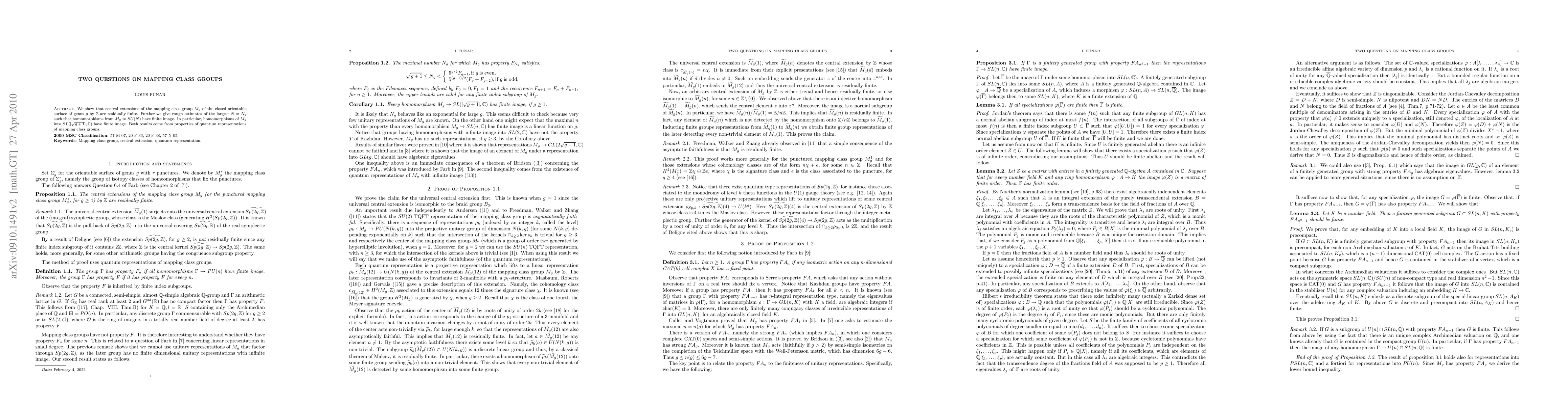 We show that central extensions of the mapping class group $M_g$ of the closed orientable surface of genus $g$ by $\Z$ are residually finite. Further we give rough estimates of the largest $N=N_g$ such that homomorphisms from $M_g$ to SU(N) have finite image. In particular, homomorphisms of $M_g$ into $SL([\sqrt{g+1}],\C)$ have finite image. Both results come from properties of quantum representations of mapping class groups.