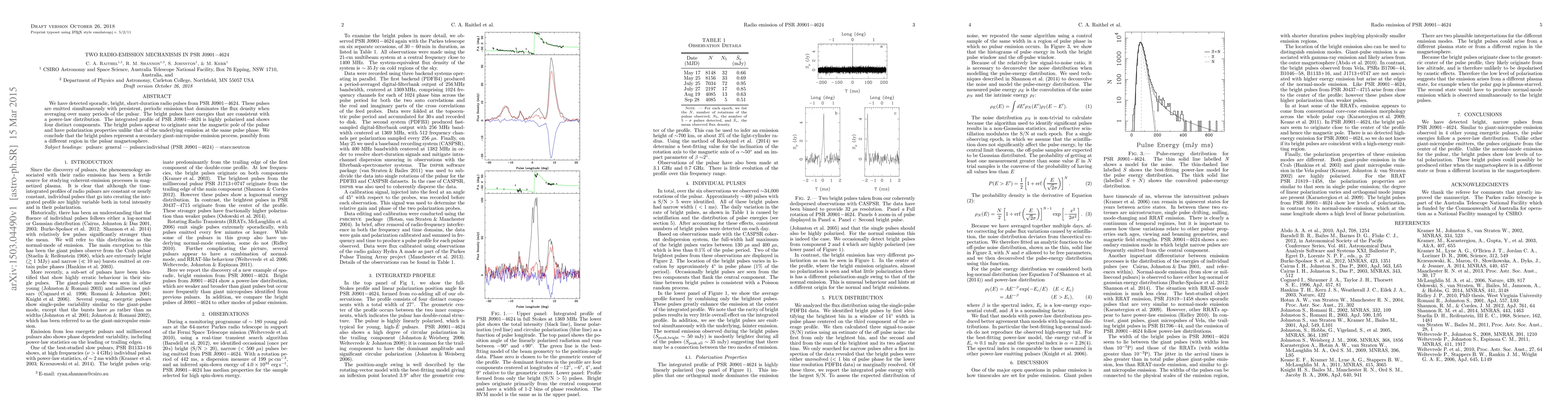 We have detected sporadic, bright, short-duration radio pulses from PSR J0901$-$4624. These pulses are emitted simultaneously with persistent, periodic emission that dominates the flux density when averaging over many periods of the pulsar. The bright pulses have energies that are consistent with a power-law distribution. The integrated profile of PSR J0901$-$4624 is highly polarized and shows four distinct components. The bright pulses appear to originate near the magnetic pole of the pulsar and have polarization properties unlike that of the underlying emission at the same pulse phase. We conclude that the bright pulses represent a secondary giant-micropulse emission process, possibly from a different region in the pulsar magnetosphere.