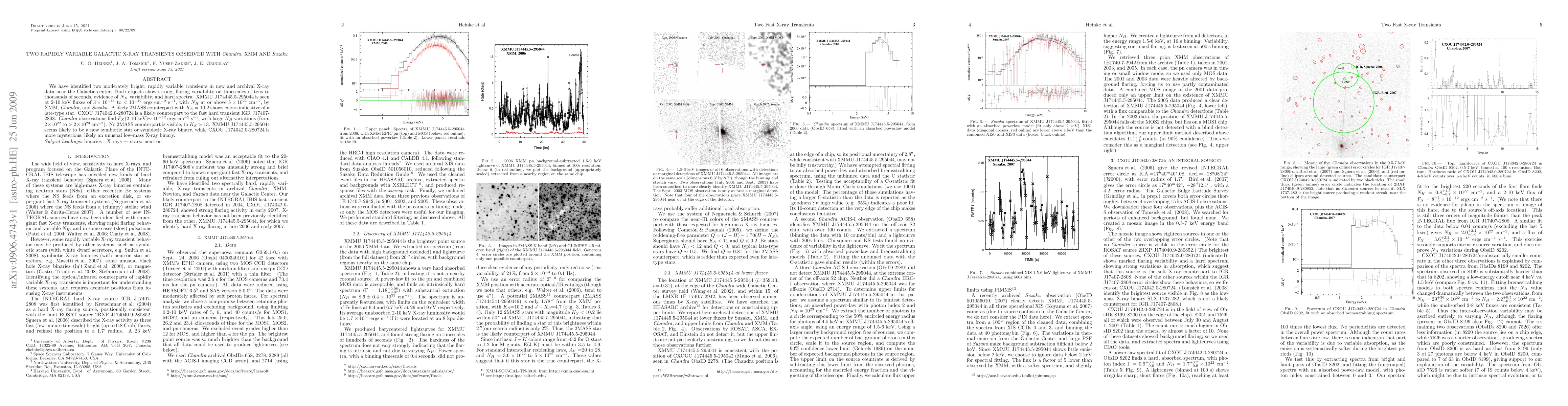 This study identifies two rapidly variable X-ray transients near the Galactic center using Chandra, XMM, and Suzaku data. One, XMMU J174445.5-295044, is likely a symbiotic star or binary with high absorption and a visible counterpart. The other, CXOU J174042.0-280724, is a mysterious, highly absorbed transient possibly being an unusual low-mass X-ray binary.