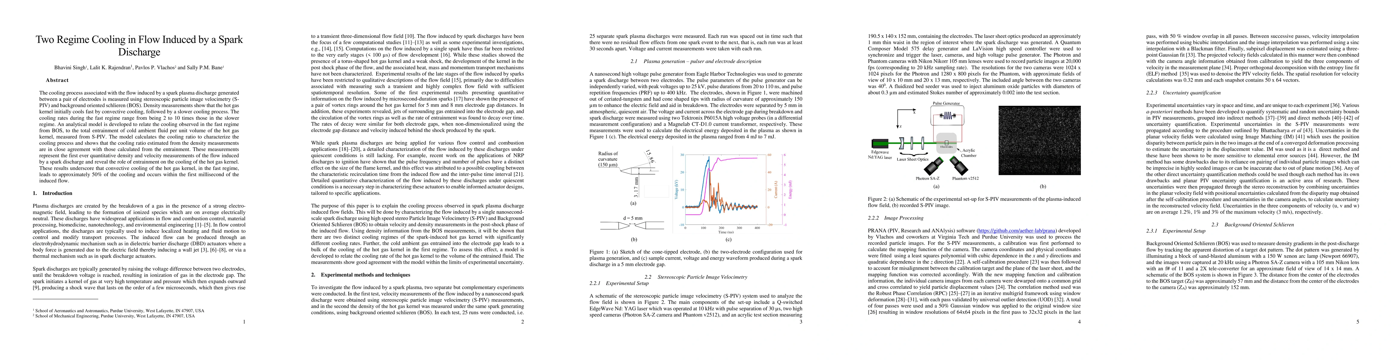 The cooling process associated with the flow induced by a spark plasma discharge generated between a pair of electrodes is measured using stereoscopic particle image velocimetry (S-PIV) and background oriented schlieren (BOS). Density measurements show that the hot gas kernel initially cools fast by convective cooling, followed by a slower cooling process. The cooling rates during the fast regime range from being 2 to 10 times those in the slower regime. An analytical model is developed to relate the cooling observed in the fast regime from BOS, to the total entrainment of cold ambient fluid per unit volume of the hot gas kernel, measured from S-PIV. The model calculates the cooling ratio to characterize the cooling process and shows that the cooling ratio estimated from the density measurements are in close agreement with those calculated from the entrainment. These measurements represent the first ever quantitative density and velocity measurements of the flow induced by a spark discharge and reveal the role of entrainment on the cooling of the hot gas kernel. These results underscore that convective cooling of the hot gas kernel, in the fast regime, leads to approximately 50% of the cooling and occurs within the first millisecond of the induced flow.