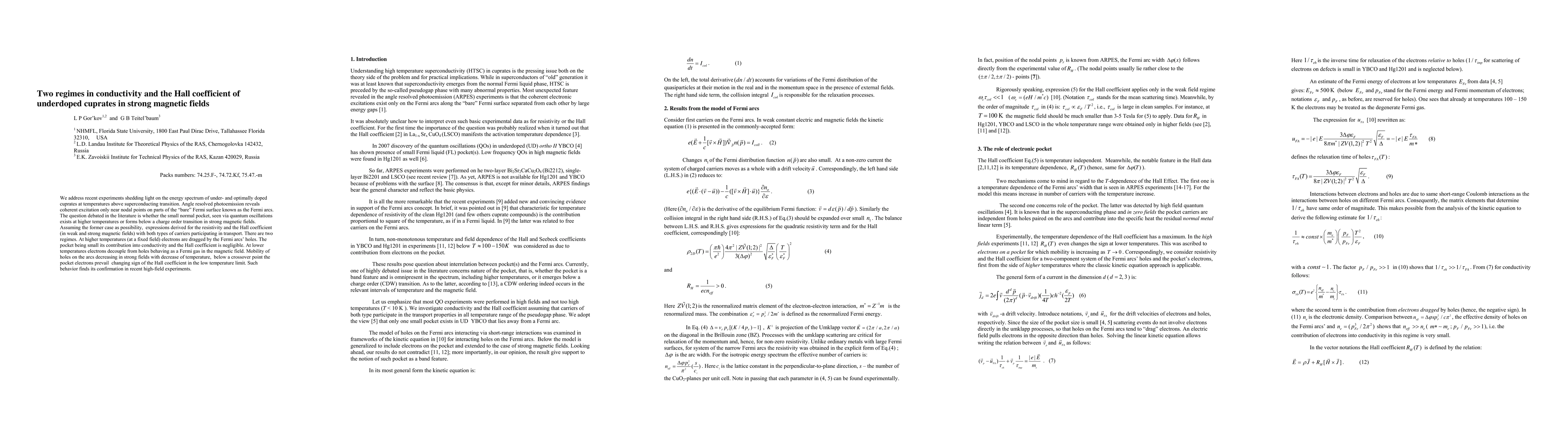 This paper explores two distinct regimes in the conductivity and Hall coefficient of underdoped cuprates under strong magnetic fields, revealing that at higher temperatures, electrons are influenced by holes on Fermi arcs, while at lower temperatures, electrons behave independently, leading to a change in the Hall coefficient's sign.