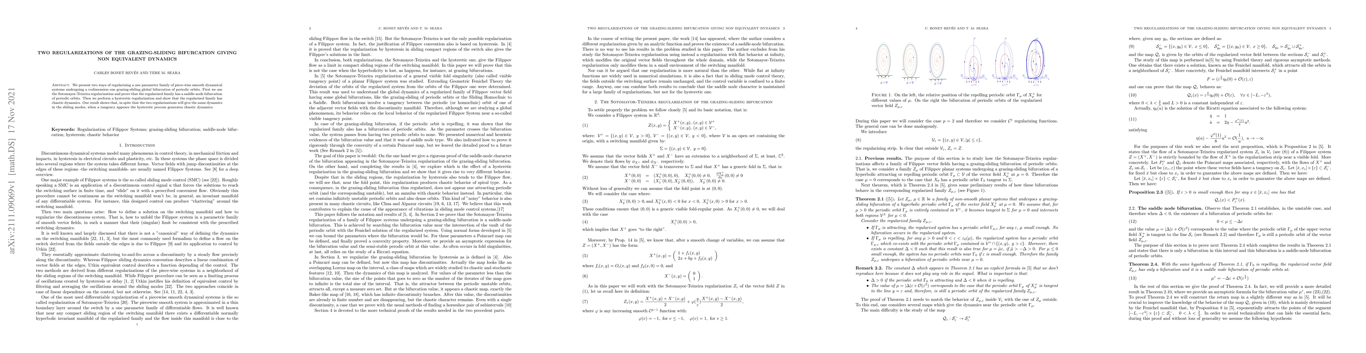 This paper explores two regularization methods for a family of piece-wise smooth dynamical systems experiencing a grazing-sliding bifurcation. The Sotomayor-Teixeira regularization leads to a saddle-node bifurcation of periodic orbits, while hysteretic regularization results in chaotic dynamics upon tangency, demonstrating non-equivalent dynamics despite similar sliding mode behavior.