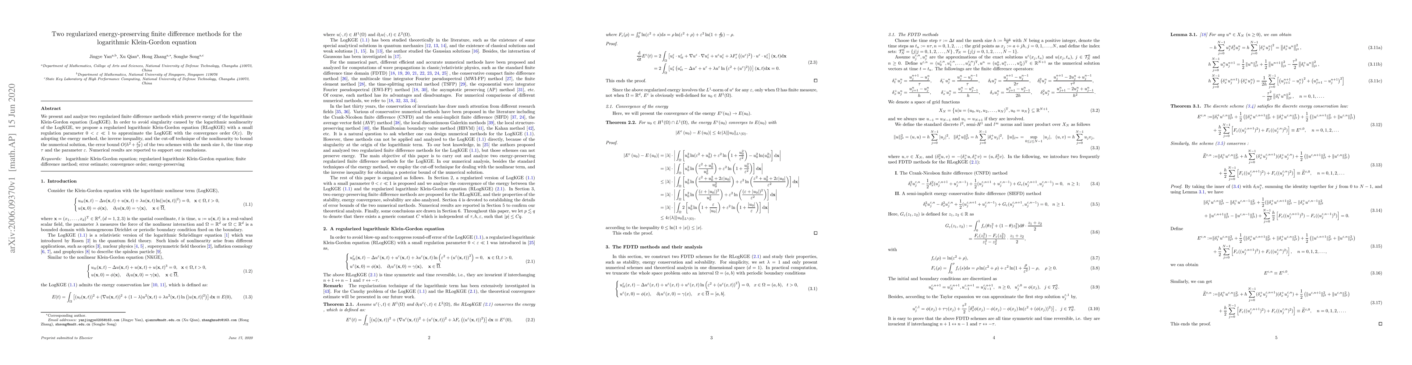This paper introduces two finite difference methods for the logarithmic Klein-Gordon equation that preserve energy, addressing the singularity from its logarithmic nonlinearity through regularization. The proposed methods achieve an error bound of $O(h^{2}+\frac{\tau^{2}}{\varepsilon^{2}})$, supported by numerical results.