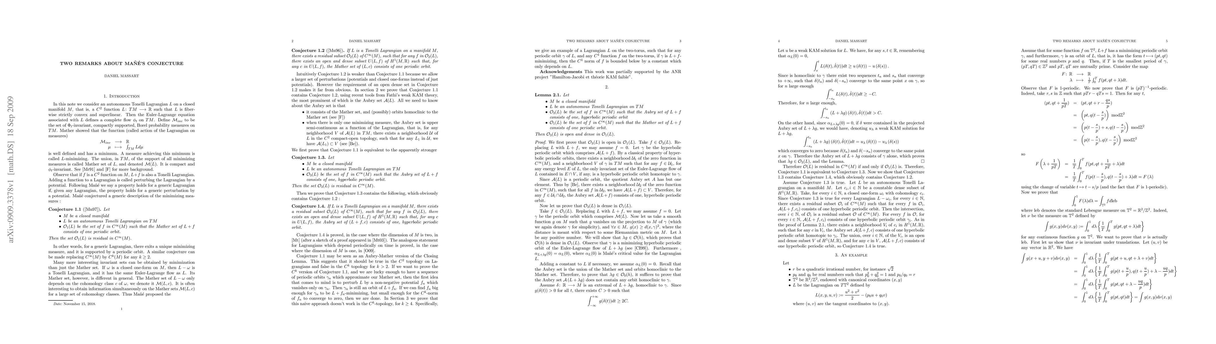 We prove that Ma\~n\'e's conjecture, as stated in {\em Lagrangian flows: the dynamics of globally minimizing orbits}, Bol. Soc. Brasil. Mat. (N.S.) 28 (1997), no. 2, 141--153, contains another conjecture of Ma\~n\'e, stated in {\em Generic properties and problems of minimizing measures of Lagrangian systems} Nonlinearity 9 (1996) 273-310.
