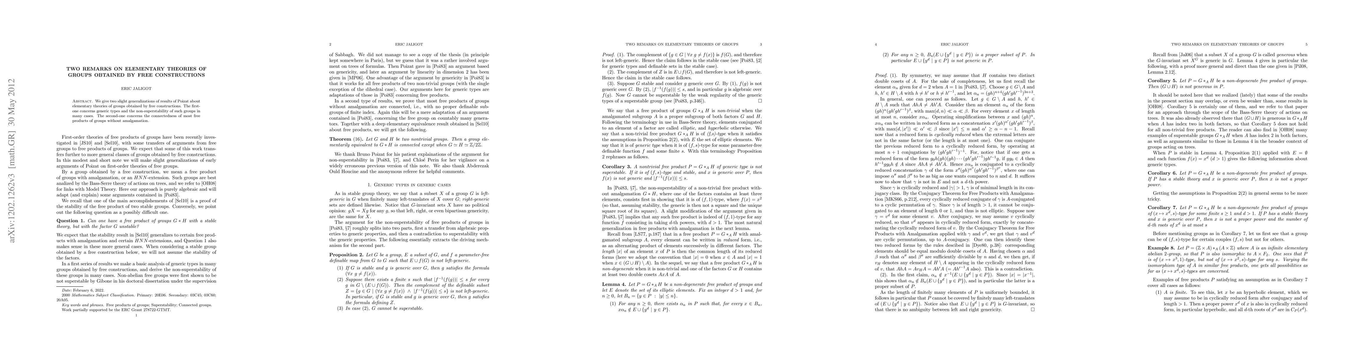 We give two slight generalizations of results of Poizat about elementary theories of groups obtained by free constructions. The first-one concerns the non-superstability of such groups in most cases, and the second-one concerns the connectedness of most free products of groups.