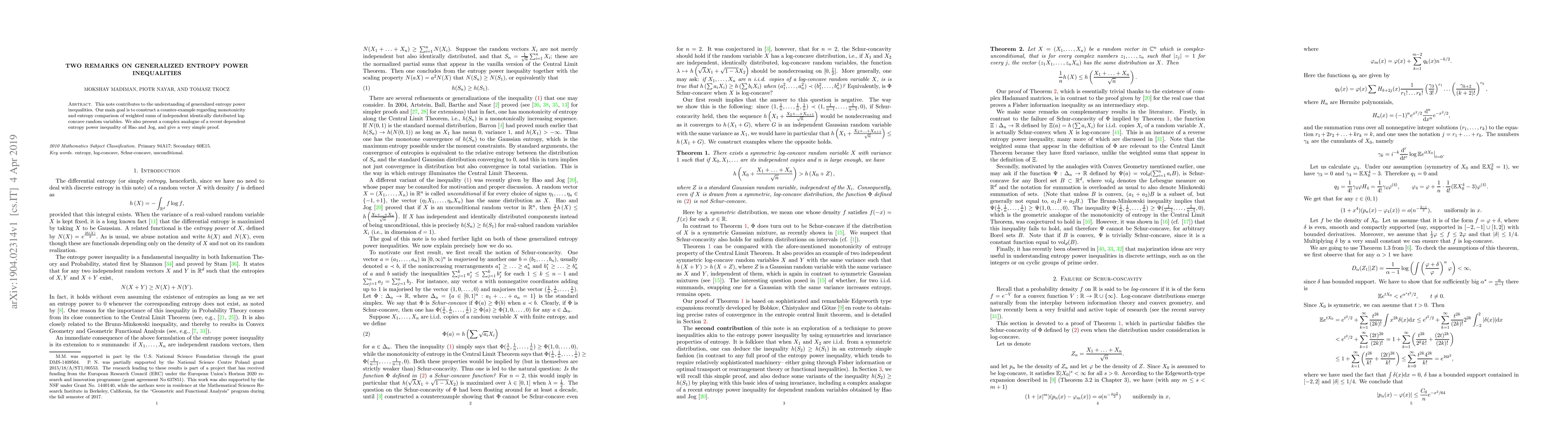 This paper explores generalized entropy power inequalities, presenting a counter-example to monotonicity and entropy comparison of weighted sums of independent log-concave random variables. Additionally, it introduces a complex analogue of a recent dependent entropy power inequality, offering a straightforward proof.