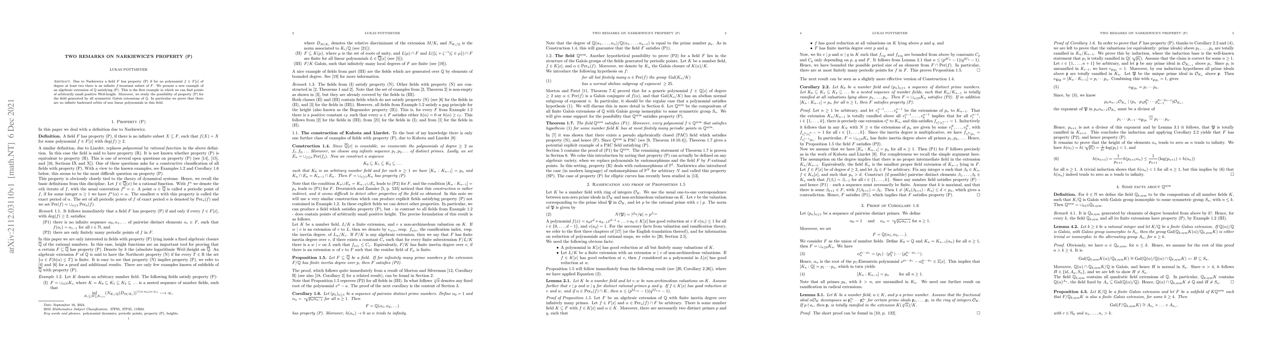 Due to Narkiewicz a field $F$ has property (P) if for no polynomial $f\in F[x]$ of degree at least two there is an infinite $f$-invariant subset of $F$. We present a new example of an algebraic extension of $\mathbb{Q}$ satisfying (P). This is the first example in which we can find points of arbitrarily small positive Weil-height. Moreover, we study the possibility of property (P) for the field generated by all symmetric Galois extensions of $\mathbb{Q}$. In particular we prove that there are no infinite backward orbits of non linear polynomials in this field.