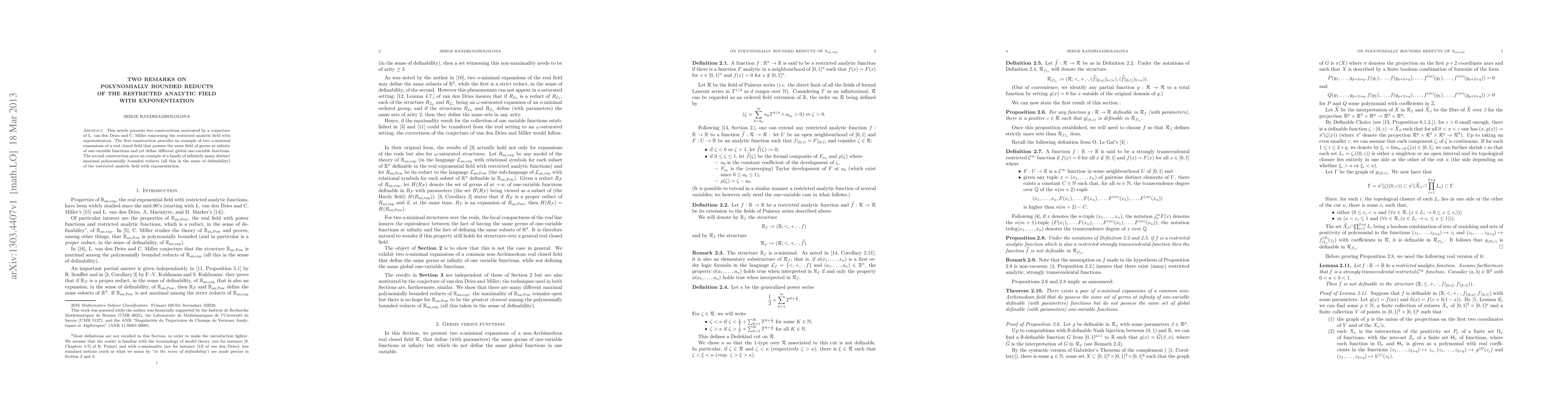This article presents two constructions motivated by a conjecture of L. van den Dries and C. Miller concerning the restricted analytic field with exponentiation. The first construction provides an example of two o-minimal expansions of a real closed field that possess the same field of germs at infinity of one-variable functions and yet define different global one-variable functions. The second construction gives an example of a family of infinitely many distinct polynomially bounded reducts (all this in the sense of definability) of the restricted analytic field with exponentiation.