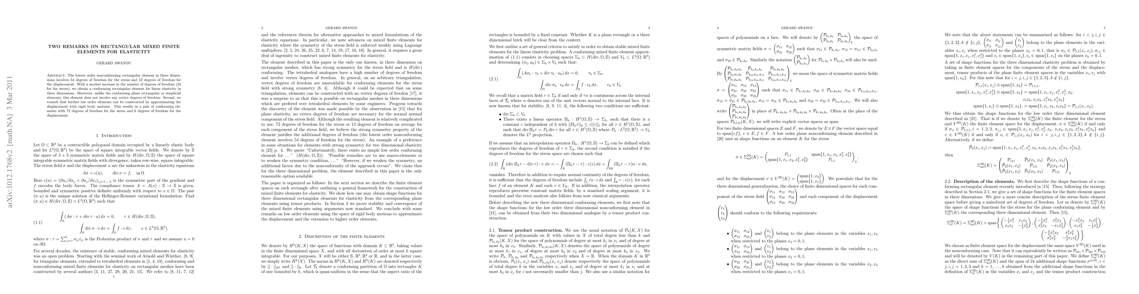 This paper introduces a conforming rectangular mixed finite element for 3D elasticity that requires 24 additional stress degrees of freedom compared to a nonconforming element, while avoiding vertex degrees of freedom. It also presents a pair of low-order conforming elements with 72 stress and 6 displacement degrees of freedom by approximating displacements using rigid body motions.