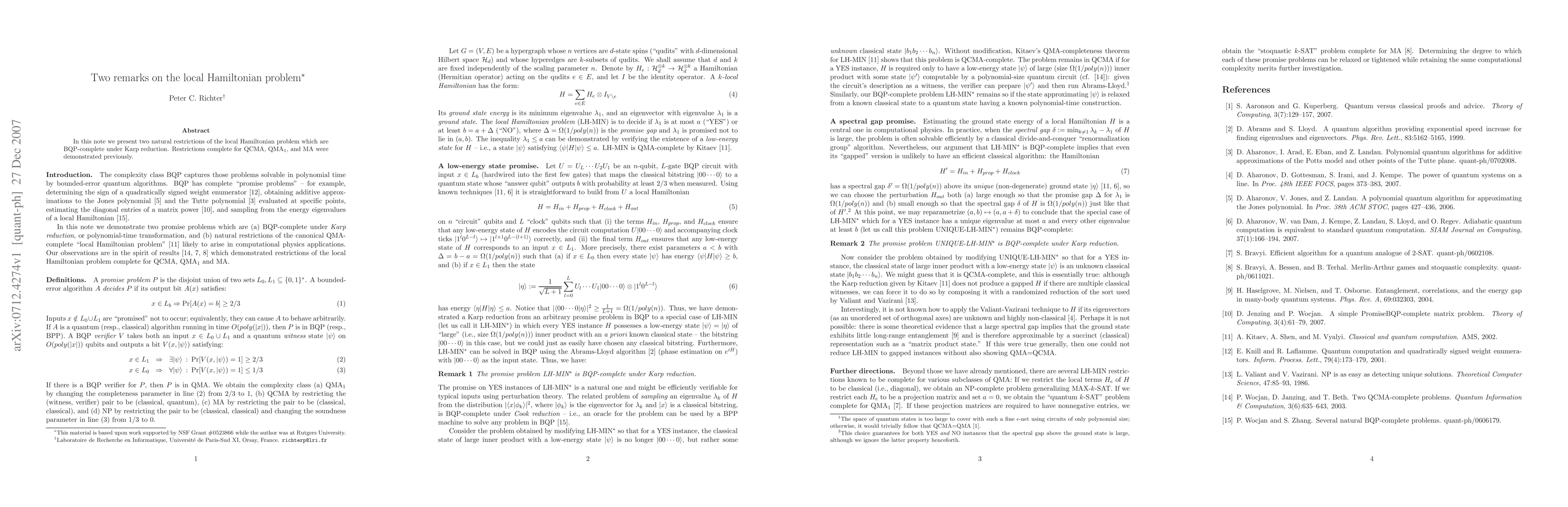 Summary: This paper introduces two new restrictions of the local Hamiltonian problem that are BQP-complete under Karp reduction. It builds on prior work demonstrating the BQP-completeness of other problem restrictions under different complexity classes.