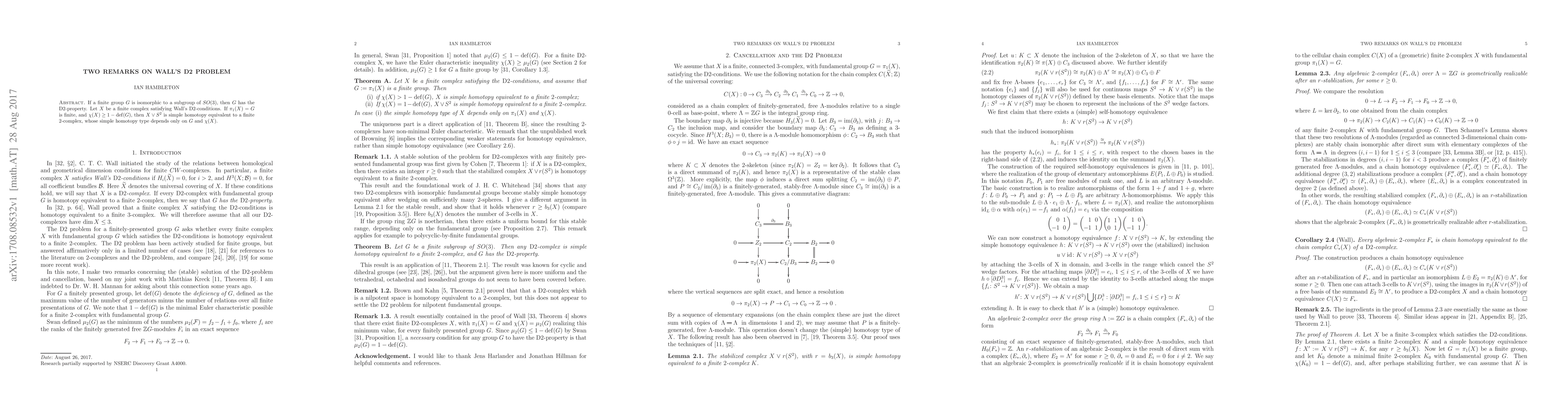 If a finite group $G$ is isomorphic to a subgroup of $SO(3)$, then $G$ has the D2-property. Let $X$ be a finite complex satisfying Wall's D2-conditions. If $\pi_1(X)=G$ is finite, and $\chi(X) \geq 1-Def(G)$, then $X \vee S^2$ is simple homotopy equivalent to a finite $2$-complex, whose simple homotopy type depends only on $G$ and $\chi(X)$.