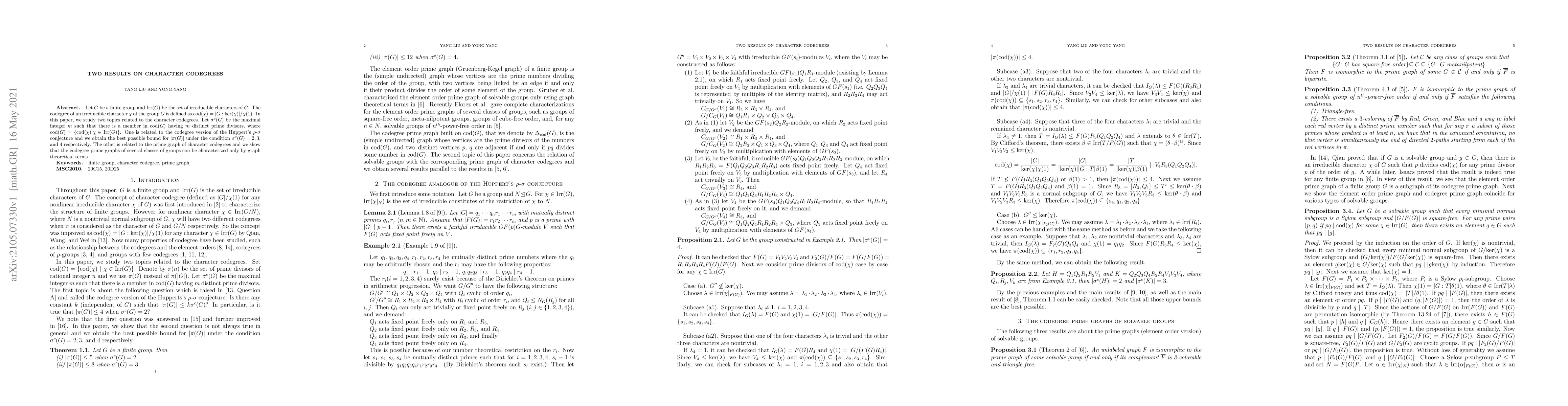 Let $G$ be a finite group and $\mathrm{Irr}(G)$ be the set of irreducible characters of $G$. The codegree of an irreducible character $\chi$ of the group $G$ is defined as $\mathrm{cod}(\chi)=|G:\mathrm{ker}(\chi)|/\chi(1)$. In this paper, we study two topics related to the character codegrees. Let $\sigma^c(G)$ be the maximal integer $m$ such that there is a member in $\mathrm{cod}(G)$ having $m$ distinct prime divisors, where $\mathrm{cod}(G)=\{\mathrm{cod}(\chi)|\chi\in \mathrm{Irr}(G)\}$. One is related to the codegree version of the Huppert's $\rho$-$\sigma$ conjecture and we obtain the best possible bound for $|\pi(G)|$ under the condition $\sigma^c(G) = 2,3,$ and $4$ respectively. The other is related to the prime graph of character codegrees and we show that the codegree prime graphs of several classes of groups can be characterized only by graph theoretical terms.