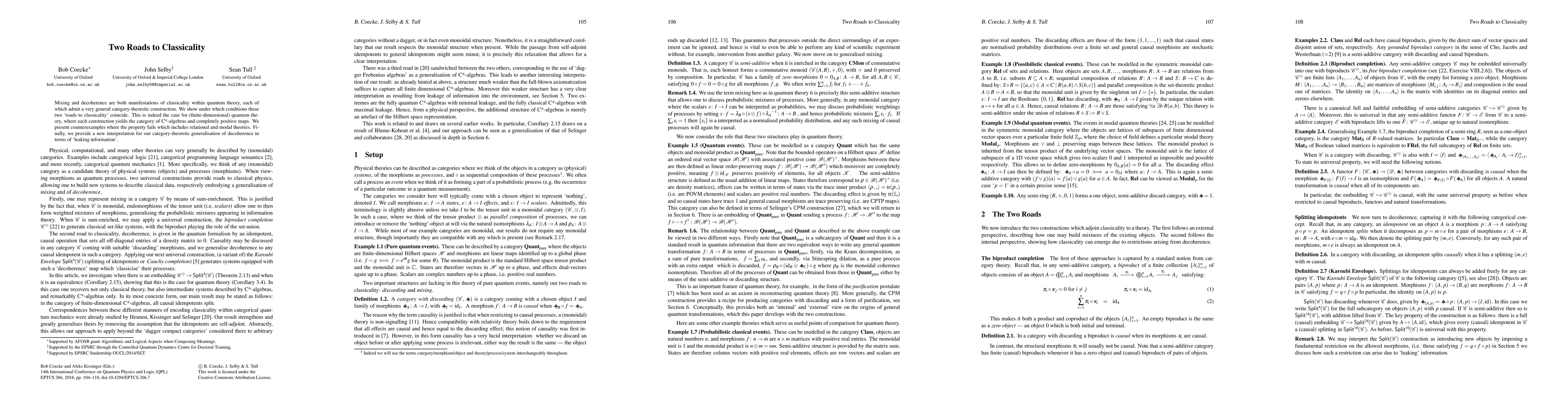 This paper explores the category-theoretic foundations of classicality in quantum theory through two paths: mixing and decoherence. It demonstrates that these paths converge in finite-dimensional quantum theory but diverges in relational and modal theories, offering a new interpretation of decoherence as 'leaking information'.