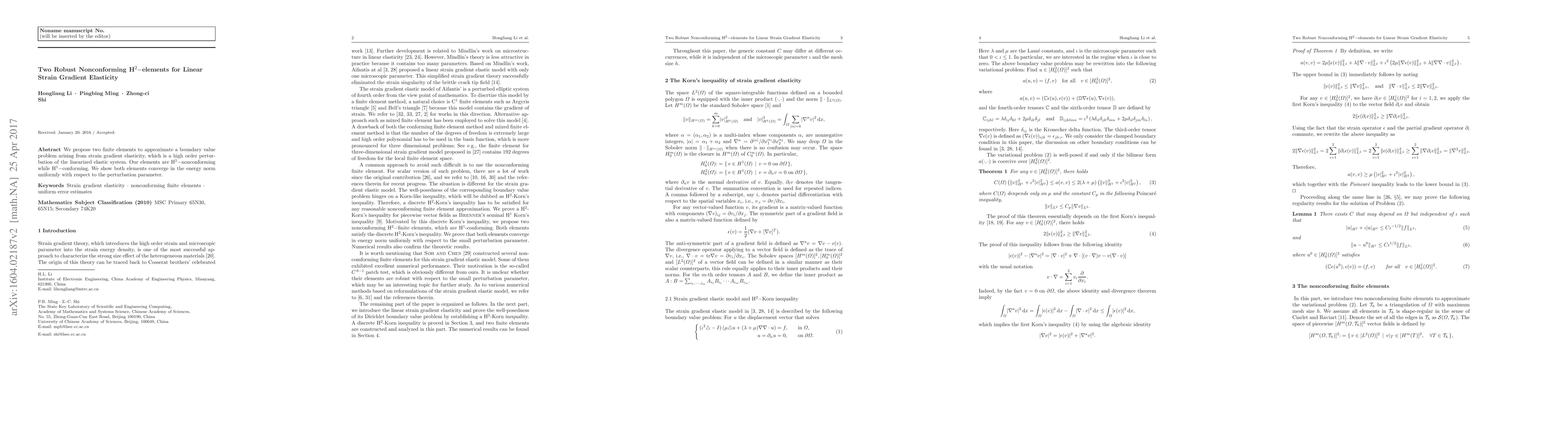 We propose two nonconforming finite elements to approximate a boundary value problem arising from strain gradient elasticity, which is a higher-order perturbation of the linearized elastic system. Our elements are H$^2-$nonconforming while H$^1-$conforming. We show both elements converges in the energy norm uniformly with respect to the perturbation parameter.