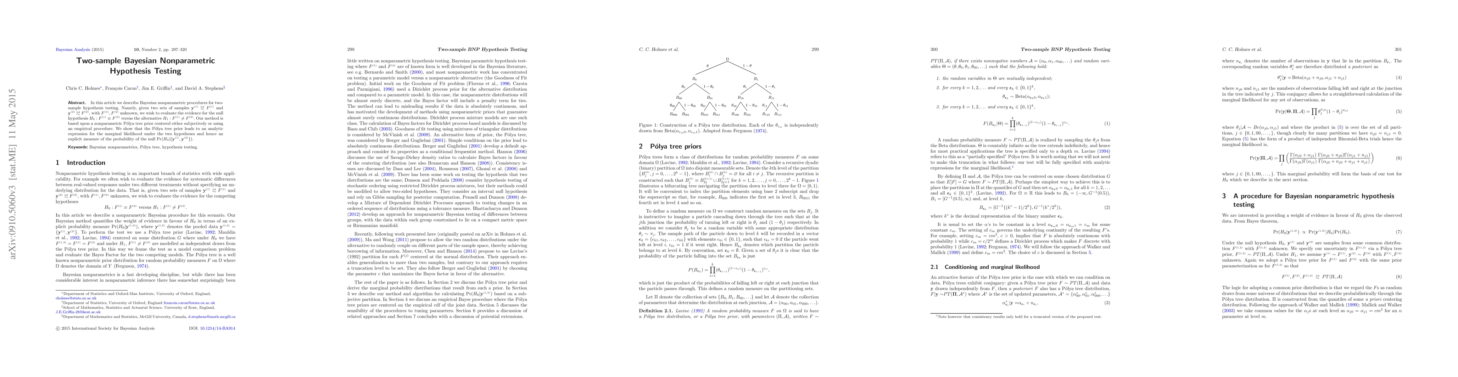 This paper proposes Bayesian nonparametric methods for two-sample hypothesis testing using a Pólya tree prior. It evaluates the evidence for the null hypothesis that two unknown distributions are identical versus the alternative that they differ.