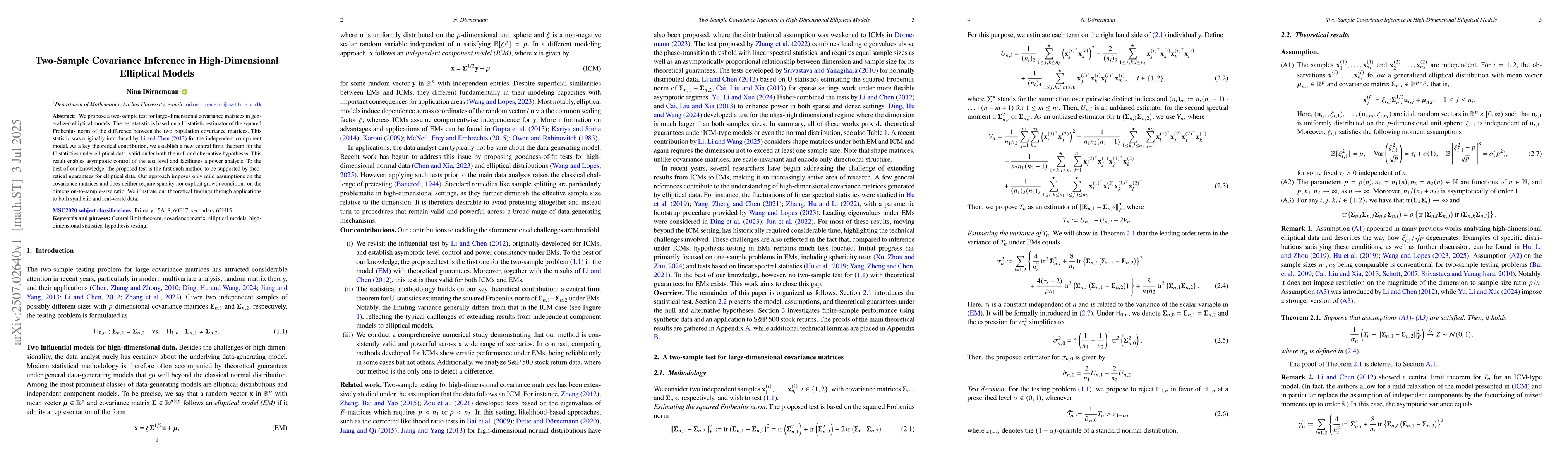 We propose a two-sample test for large-dimensional covariance matrices in generalized elliptical models. The test statistic is based on a U-statistic estimator of the squared Frobenius norm of the difference between the two population covariance matrices. This statistic was originally introduced by Li and Chen (2012, AoS) for the independent component model. As a key theoretical contribution, we establish a new central limit theorem for the U-statistics under elliptical data, valid under both the null and alternative hypotheses. This result enables asymptotic control of the test level and facilitates a power analysis. To the best of our knowledge, the proposed test is the first such method to be supported by theoretical guarantees for elliptical data. Our approach imposes only mild assumptions on the covariance matrices and does neither require sparsity nor explicit growth conditions on the dimension-to-sample-size ratio. We illustrate our theoretical findings through applications to both synthetic and real-world data.