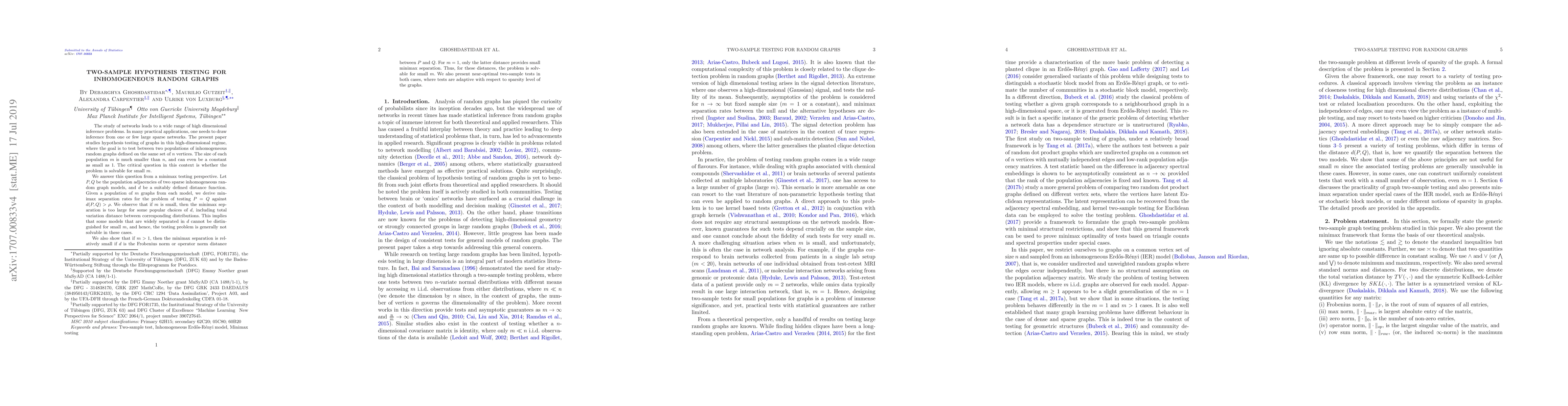 The study of networks leads to a wide range of high dimensional inference problems. In many practical applications, one needs to draw inference from one or few large sparse networks. The present paper studies hypothesis testing of graphs in this high-dimensional regime, where the goal is to test between two populations of inhomogeneous random graphs defined on the same set of $n$ vertices. The size of each population $m$ is much smaller than $n$, and can even be a constant as small as 1. The critical question in this context is whether the problem is solvable for small $m$. We answer this question from a minimax testing perspective. Let $P,Q$ be the population adjacencies of two sparse inhomogeneous random graph models, and $d$ be a suitably defined distance function. Given a population of $m$ graphs from each model, we derive minimax separation rates for the problem of testing $P=Q$ against $d(P,Q)>\rho$. We observe that if $m$ is small, then the minimax separation is too large for some popular choices of $d$, including total variation distance between corresponding distributions. This implies that some models that are widely separated in $d$ cannot be distinguished for small $m$, and hence, the testing problem is generally not solvable in these cases. We also show that if $m>1$, then the minimax separation is relatively small if $d$ is the Frobenius norm or operator norm distance between $P$ and $Q$. For $m=1$, only the latter distance provides small minimax separation. Thus, for these distances, the problem is solvable for small $m$. We also present near-optimal two-sample tests in both cases, where tests are adaptive with respect to sparsity level of the graphs.