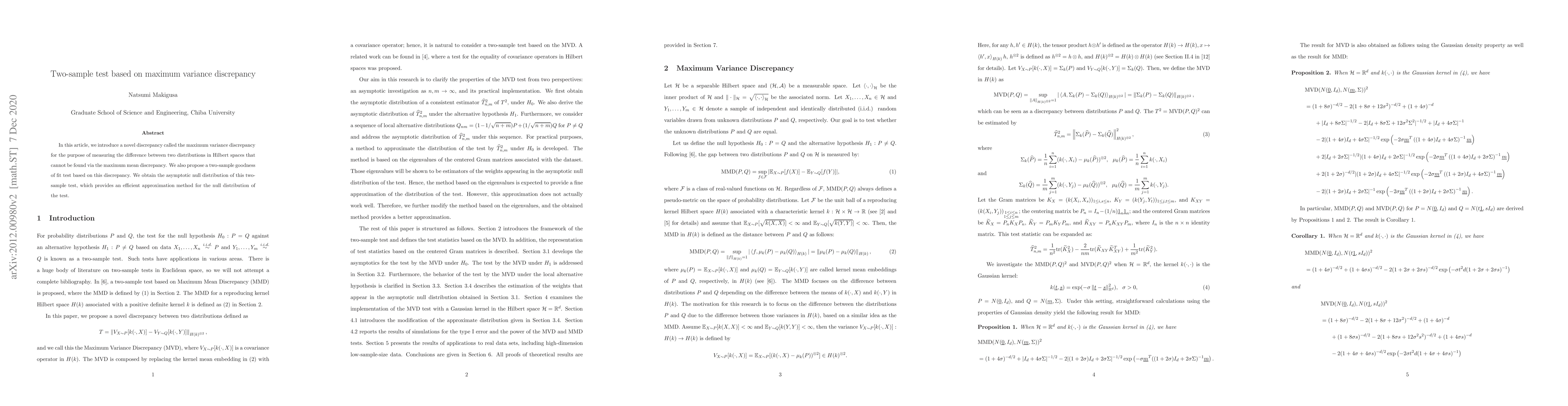 This paper introduces the maximum variance discrepancy to measure differences between two distributions in Hilbert spaces, proposing a new two-sample test based on it. The authors provide an asymptotic null distribution for the test, offering an efficient approximation method for its null distribution.