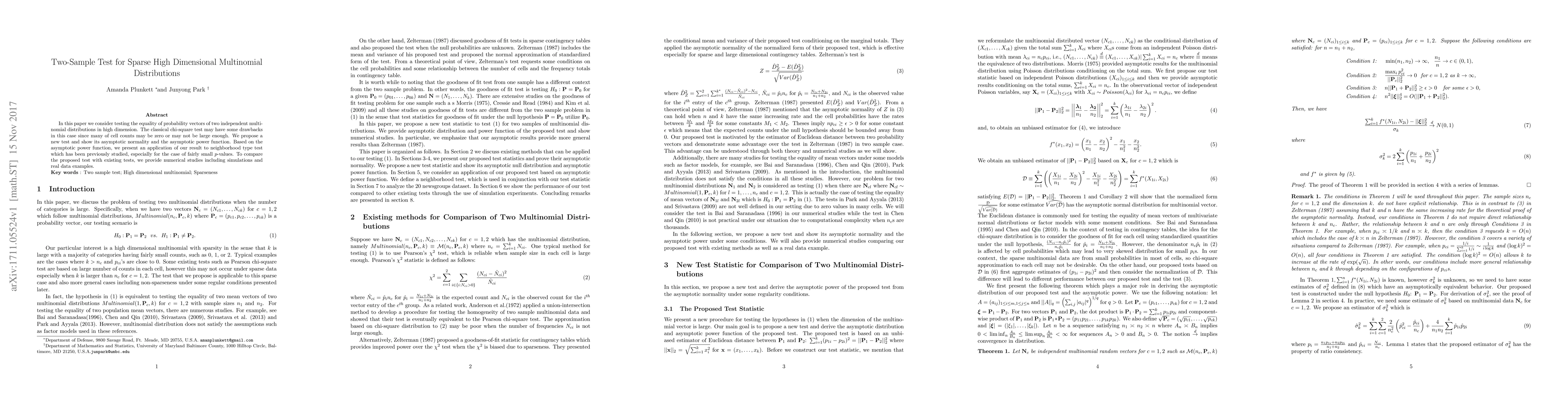 In this paper we consider testing the equality of probability vectors of two independent multinomial distributions in high dimension. The classical chi-square test may have some drawbacks in this case since many of cell counts may be zero or may not be large enough. We propose a new test and show its asymptotic normality and the asymptotic power function. Based on the asymptotic power function, we present an application of our result to neighborhood type test which has been previously studied, especially for the case of fairly small $p$-values. To compare the proposed test with existing tests, we provide numerical studies including simulations and real data examples.