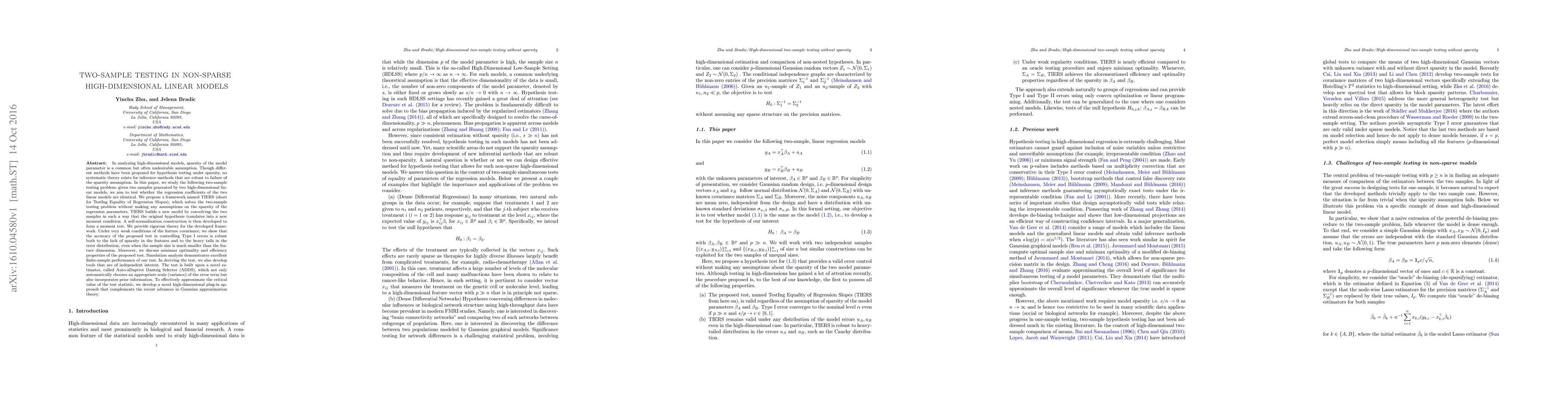 This paper proposes TIERS, a framework for two-sample testing in high-dimensional linear models without sparsity assumptions. It uses a novel Auto-aDaptive Dantzig Selector (ADDS) and a self-normalization construction to develop a robust test, demonstrating minimax optimality and efficient performance even when sample size is smaller than feature dimension.