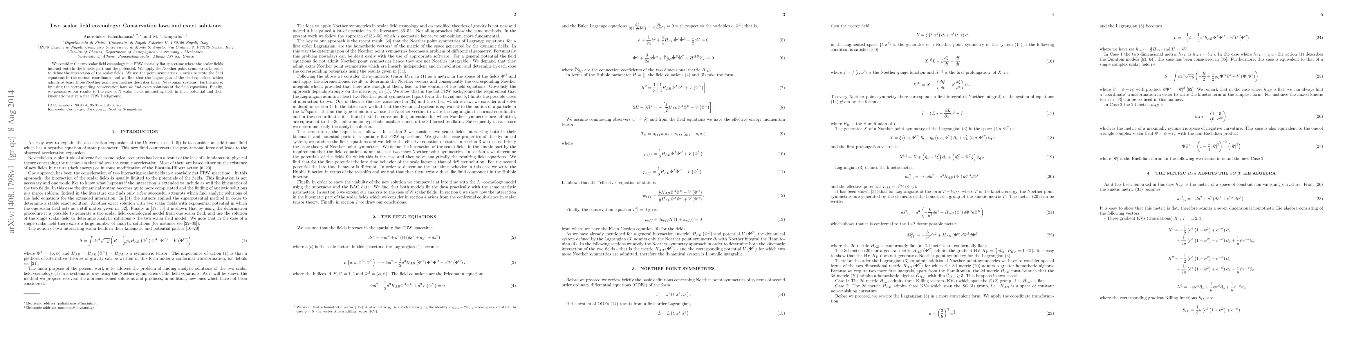 This paper explores two scalar field cosmology in a flat FRW spacetime, utilizing Noether point symmetries to derive conservation laws and find exact solutions for the field equations. It generalizes the findings to N interacting scalar fields in a similar cosmological model.