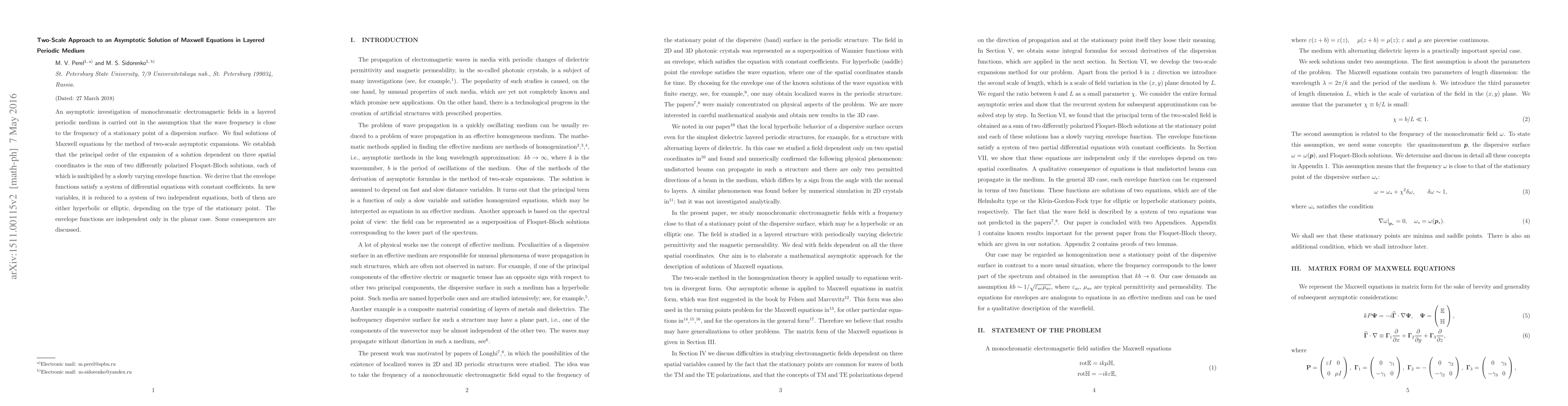 This research presents a two-scale asymptotic solution approach for Maxwell equations in layered periodic media near a stationary point of the dispersion surface. It derives that the solution is a sum of two polarized Floquet-Bloch solutions with slowly varying envelope functions, which satisfy differential equations with constant coefficients. The system reduces to two independent equations, either hyperbolic or elliptic, depending on the stationary point type. The method provides insights into planar and non-planar cases.