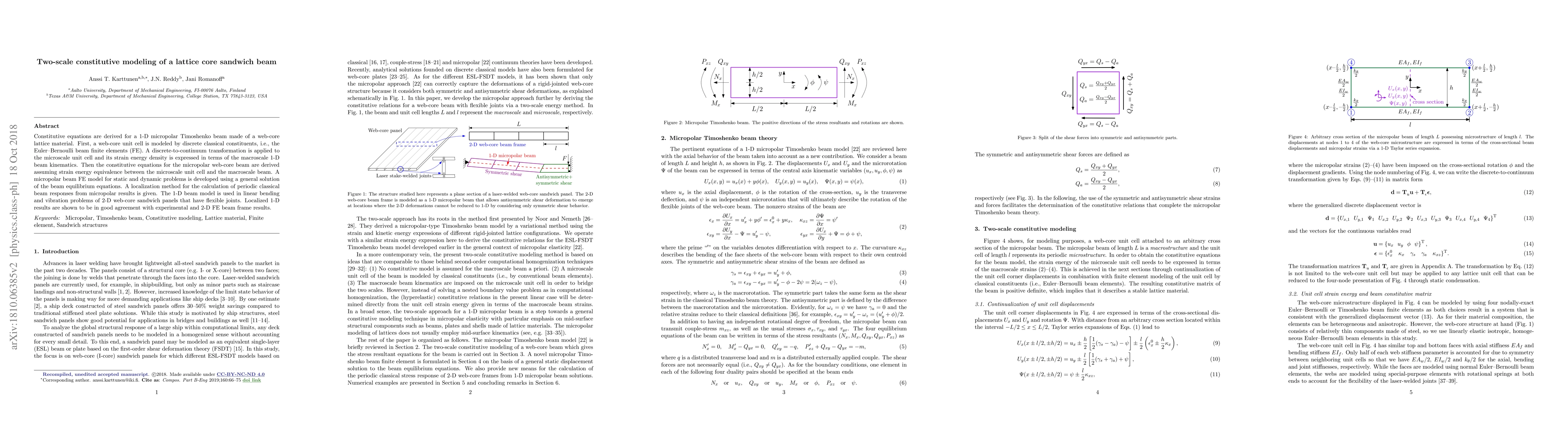 This paper develops constitutive equations for a micropolar Timoshenko beam with a lattice core, using a two-scale approach that links microscale unit cell models to macroscale beam dynamics. The derived equations are validated through comparisons with experimental and 2-D finite element results for bending and vibration of sandwich panels.