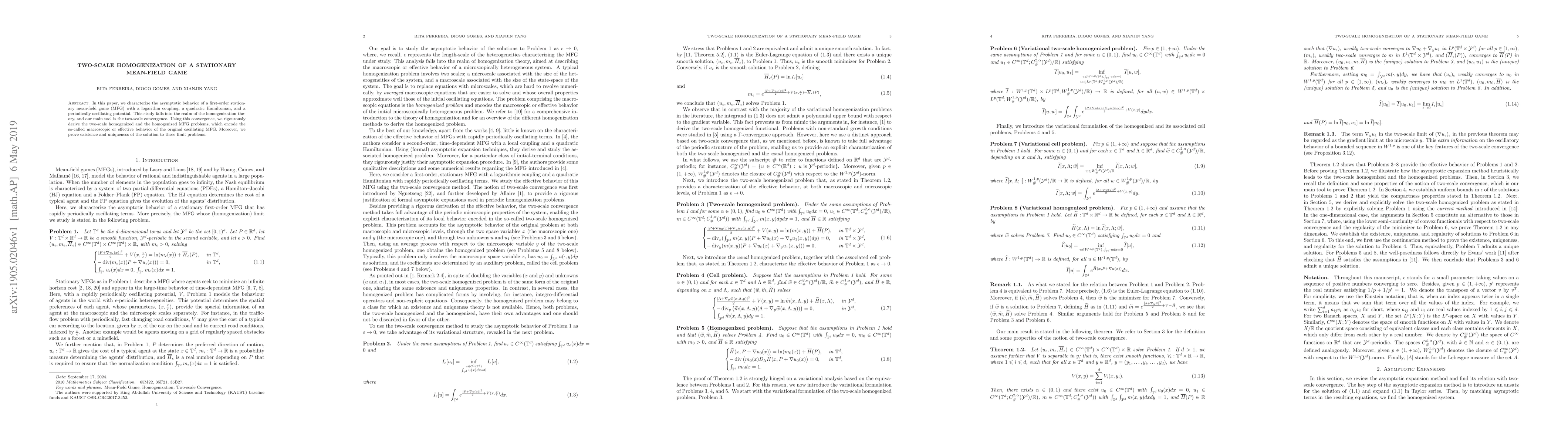 In this paper, we characterize the asymptotic behavior of a first-order stationary mean-field game (MFG) with a logarithm coupling, a quadratic Hamiltonian, and a periodically oscillating potential. This study falls into the realm of the homogenization theory, and our main tool is the two-scale convergence. Using this convergence, we rigorously derive the two-scale homogenized and the homogenized MFG problems, which encode the so-called macroscopic or effective behavior of the original oscillating MFG. Moreover, we prove existence and uniqueness of the solution to these limit problems.
