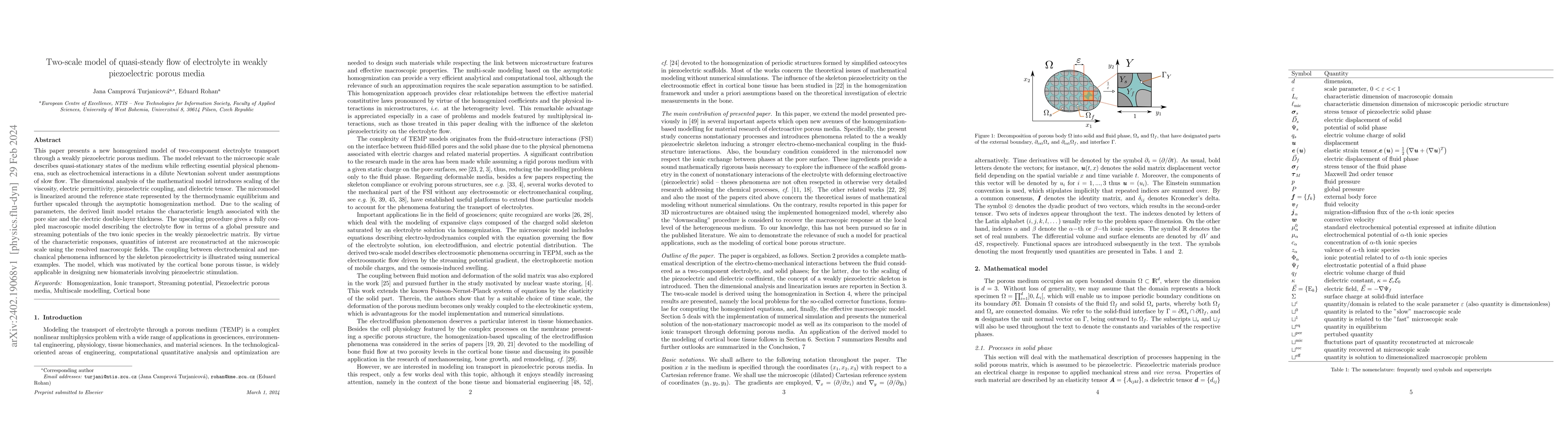 This paper develops a homogenized two-scale model for quasi-steady flow of electrolytes in weakly piezoelectric porous media, capturing essential physical phenomena and providing a macroscopic model describing electrolyte flow through global pressure and streaming potentials, useful for biomaterial design.