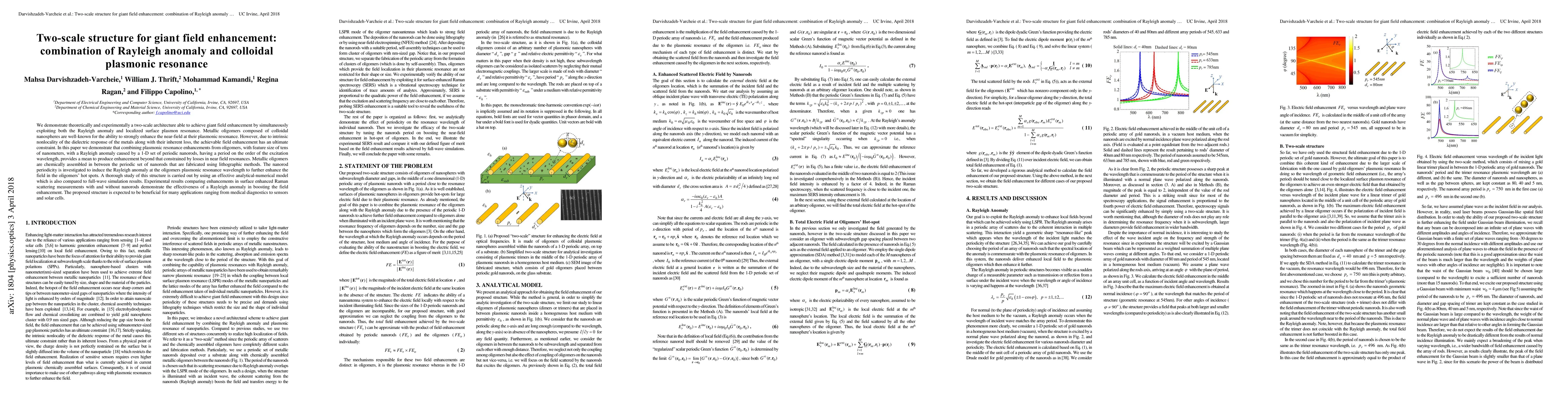 This paper presents a two-scale architecture combining Rayleigh anomaly and colloidal plasmonic resonance to achieve giant field enhancement, overcoming the limitations of metallic oligomers. The structure, consisting of metallic nanosphere oligomers between periodic nanorods, is shown to significantly boost field enhancement in both theoretical and experimental studies.