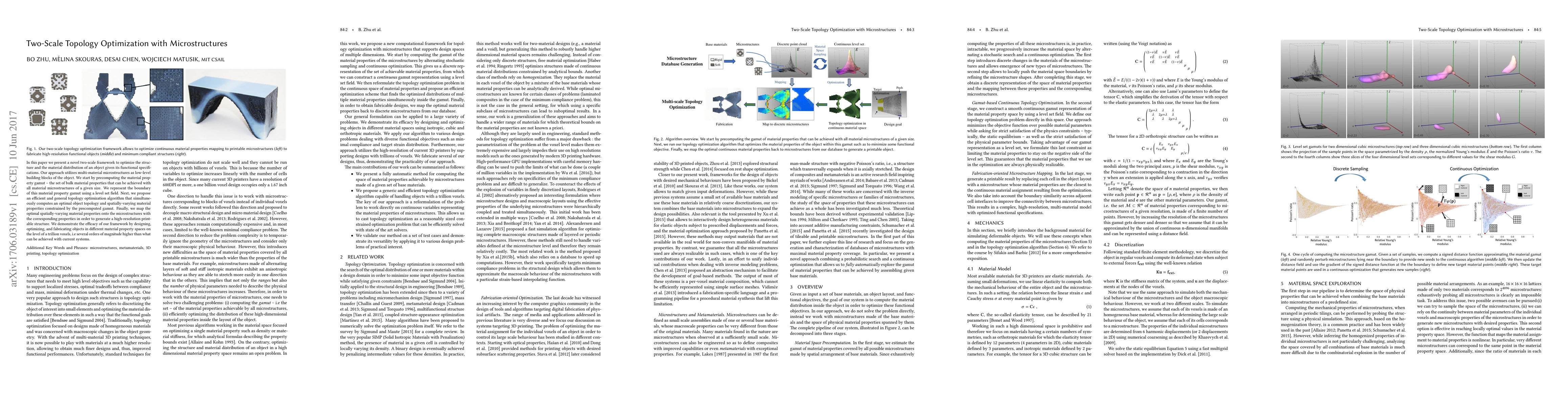 In this paper we present a novel two-scale framework to optimize the structure and the material distribution of an object given its functional specifications. Our approach utilizes multi-material microstructures as low-level building blocks of the object. We start by precomputing the material property gamut -- the set of bulk material properties that can be achieved with all material microstructures of a given size. We represent the boundary of this material property gamut using a level set field. Next, we propose an efficient and general topology optimization algorithm that simultaneously computes an optimal object topology and spatially-varying material properties constrained by the precomputed gamut. Finally, we map the optimal spatially-varying material properties onto the microstructures with the corresponding properties in order to generate a high-resolution printable structure. We demonstrate the efficacy of our framework by designing, optimizing, and fabricating objects in different material property spaces on the level of a trillion voxels, i.e several orders of magnitude higher than what can be achieved with current systems.