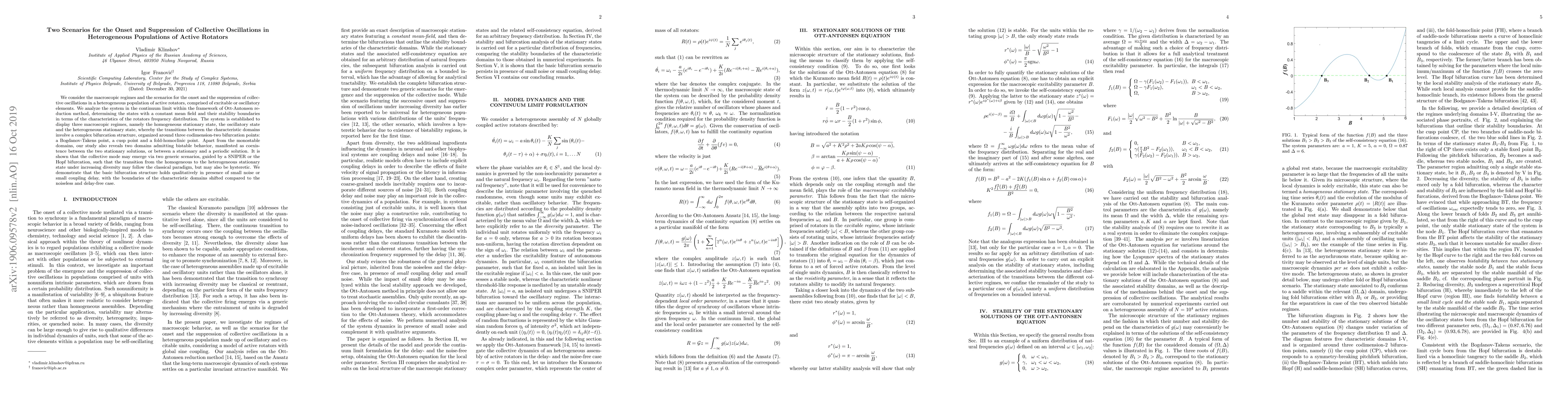 Research explores how collective oscillations emerge in heterogeneous populations of active rotators, revealing three macroscopic regimes with complex bifurcation structures, and proposes two scenarios for their onset and suppression.