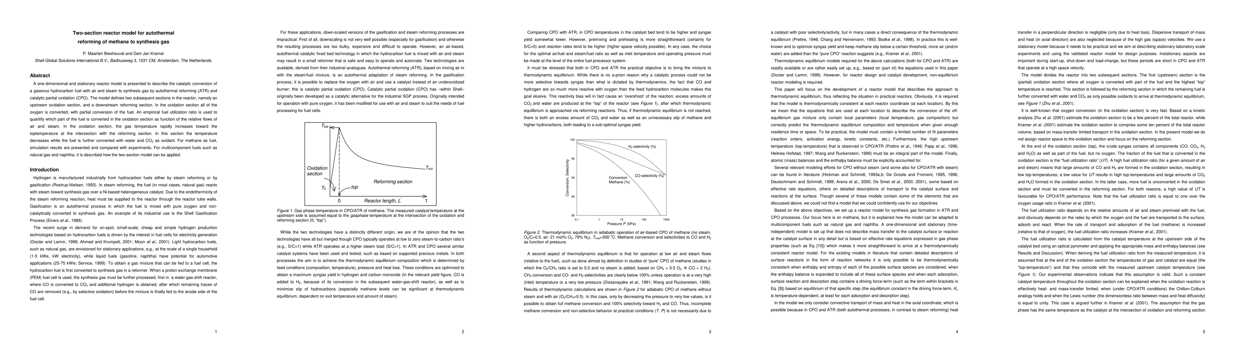 This paper presents a two-section reactor model for autothermal reforming of methane to synthesis gas, detailing an upstream oxidation section and a downstream reforming section. Simulation results for methane are compared with experiments, and the model's applicability to multicomponent fuels is discussed.