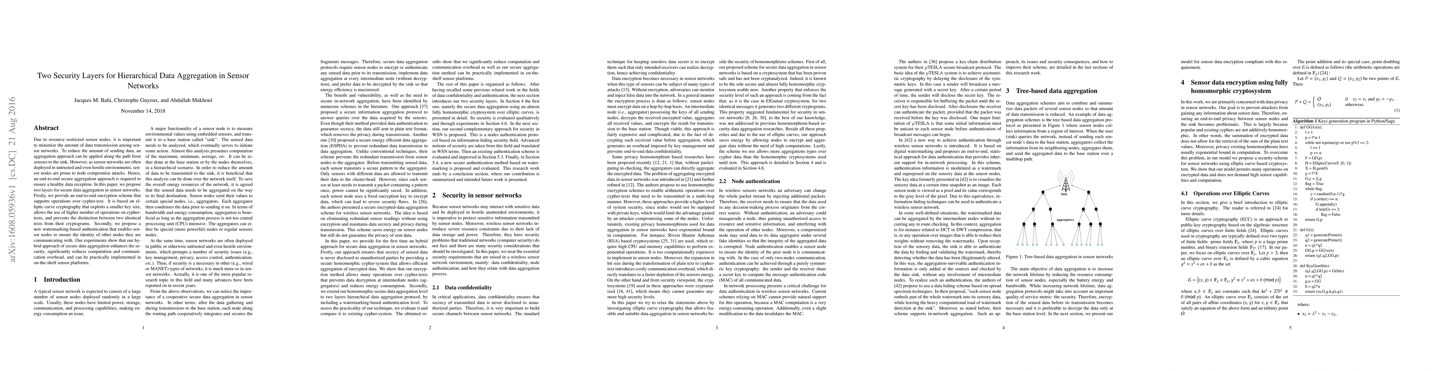 Due to resource restricted sensor nodes, it is important to minimize the amount of data transmission among sensor networks. To reduce the amount of sending data, an aggregation approach can be applied along the path from sensors to the sink. However, as sensor networks are often deployed in untrusted and even hostile environments, sensor nodes are prone to node compromise attacks. Hence, an end-to-end secure aggregation approach is required to ensure a healthy data reception. In this paper, we propose two layers for secure data aggregation in sensor networks. Firstly, we provide an end-to-end encryption scheme that supports operations over cypher-text. It is based on elliptic curve cryptography that exploits a smaller key size, allows the use of higher number of operations on cypher-texts, and prevents the distinction between two identical texts from their cryptograms. Secondly, we propose a new watermarking-based authentication that enables sensor nodes to ensure the identity of other nodes they are communicating with. Our experiments show that our hybrid approach of secure data aggregation enhances the security, significantly reduces computation and communication overhead, and can be practically implemented in on-the-shelf sensor platforms.