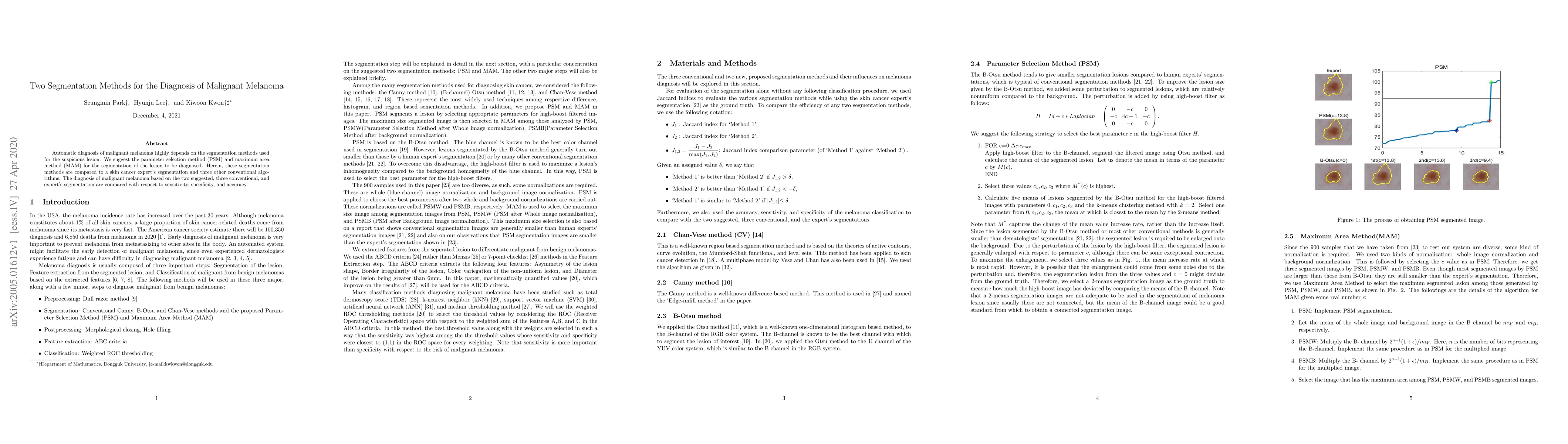 Researchers propose two segmentation methods for diagnosing malignant melanoma, comparing their performance to conventional algorithms and expert analysis in terms of sensitivity, specificity, and accuracy.