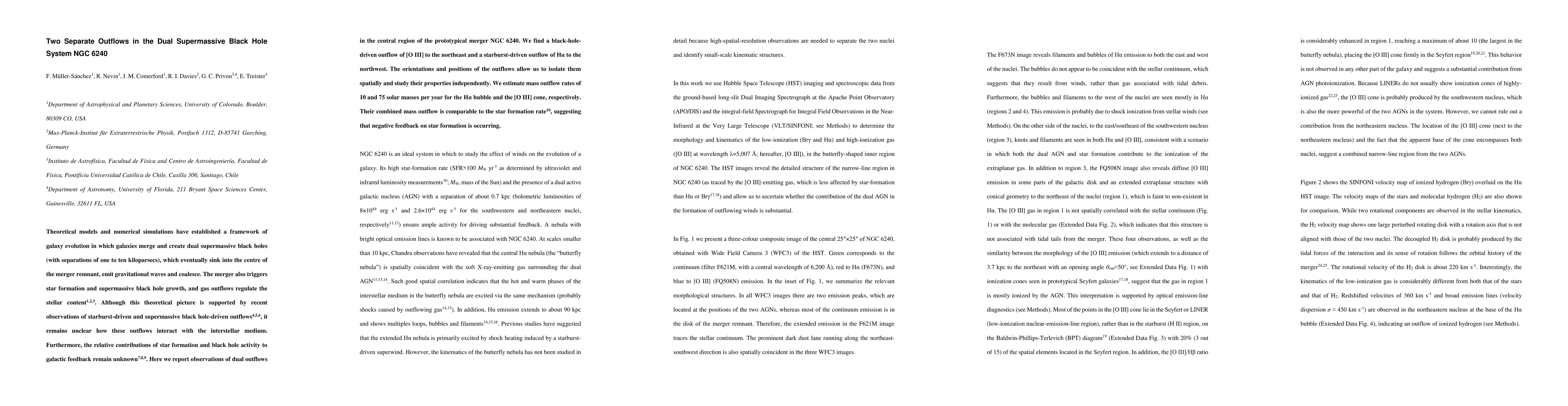 This paper reports observations of dual outflows in NGC 6240, revealing a black-hole-driven outflow to the northeast and a starburst-driven outflow to the northwest, suggesting significant negative feedback on star formation. The estimated mass outflow rates indicate substantial regulation of the stellar content.