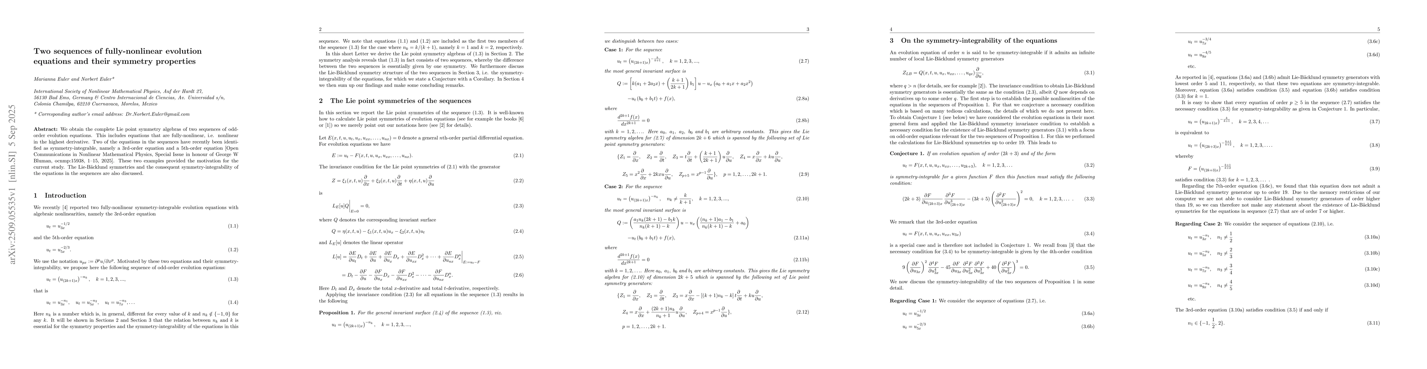 We obtain the complete Lie point symmetry algebras of two sequences of odd-order evolution equations. This includes equations that are fully-nonlinear, i.e. nonlinear in the highest derivative. Two of the equations in the sequences have recently been identified as symmetry-integrable, namely a 3rd-order equation and a 5th-order equation [Open Communications in Nonlinear Mathematical Physics, Special Issue in honour of George W Bluman, ocnmp:15938, 1--15, 2025]. These two examples provided the motivation for the current study. The Lie-B\"acklund symmetries and the consequent symmetry-integrability of the equations in the sequences are also discussed.