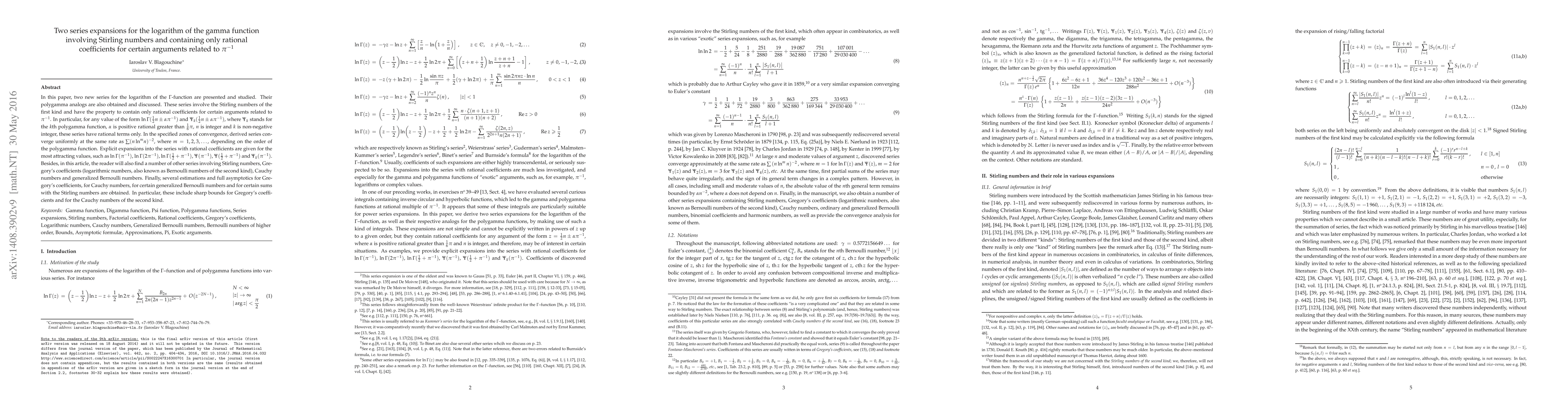 The paper presents two new series expansions for the logarithm of the gamma function involving Stirling numbers, with rational coefficients for certain arguments related to pi^-1, and discusses their polygamma analogs.