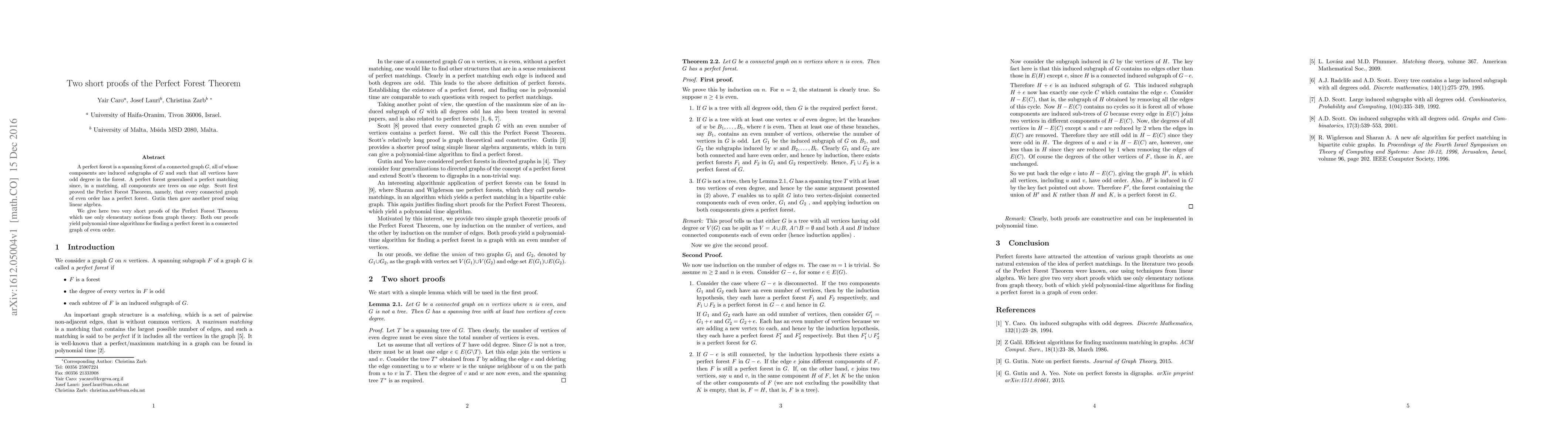 This paper presents two concise proofs of the Perfect Forest Theorem, demonstrating that every connected graph of even order contains a perfect forest where all components are induced subgraphs with all vertices having odd degree. Both proofs are elementary and lead to polynomial-time algorithms for finding such forests.