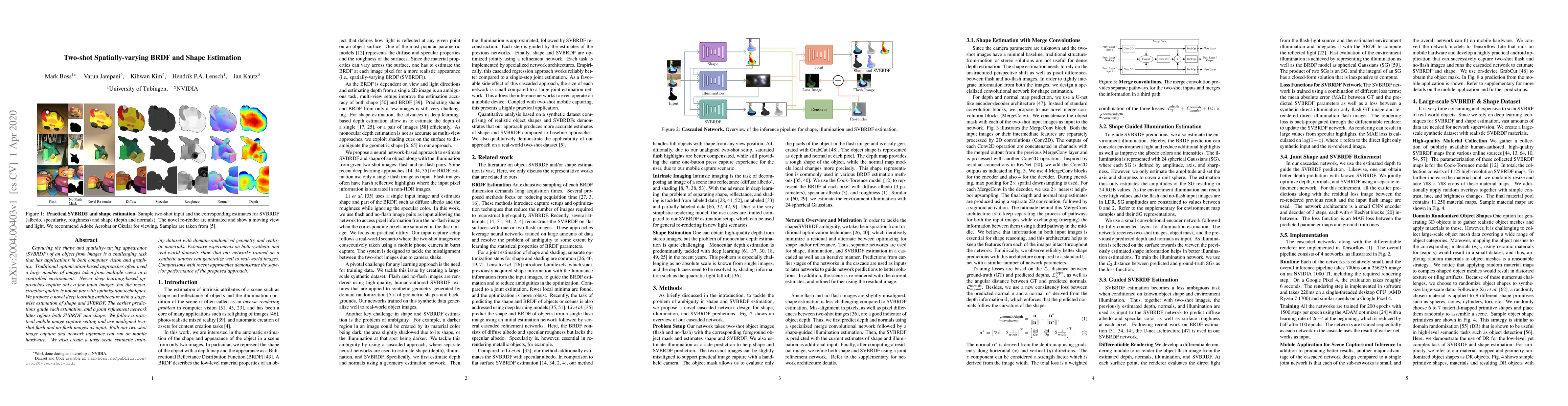 Capturing the shape and spatially-varying appearance (SVBRDF) of an object from images is a challenging task that has applications in both computer vision and graphics. Traditional optimization-based approaches often need a large number of images taken from multiple views in a controlled environment. Newer deep learning-based approaches require only a few input images, but the reconstruction quality is not on par with optimization techniques. We propose a novel deep learning architecture with a stage-wise estimation of shape and SVBRDF. The previous predictions guide each estimation, and a joint refinement network later refines both SVBRDF and shape. We follow a practical mobile image capture setting and use unaligned two-shot flash and no-flash images as input. Both our two-shot image capture and network inference can run on mobile hardware. We also create a large-scale synthetic training dataset with domain-randomized geometry and realistic materials. Extensive experiments on both synthetic and real-world datasets show that our network trained on a synthetic dataset can generalize well to real-world images. Comparisons with recent approaches demonstrate the superior performance of the proposed approach.