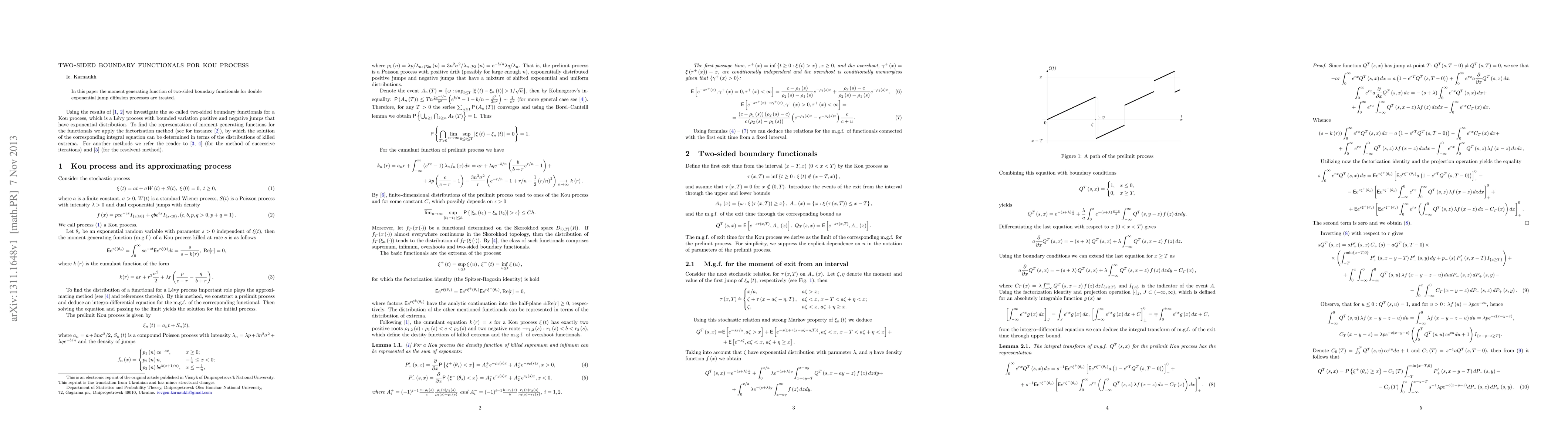 In this paper the moment generating function of two-sided boundary functionals for double exponential jump diffusion processes are treated.