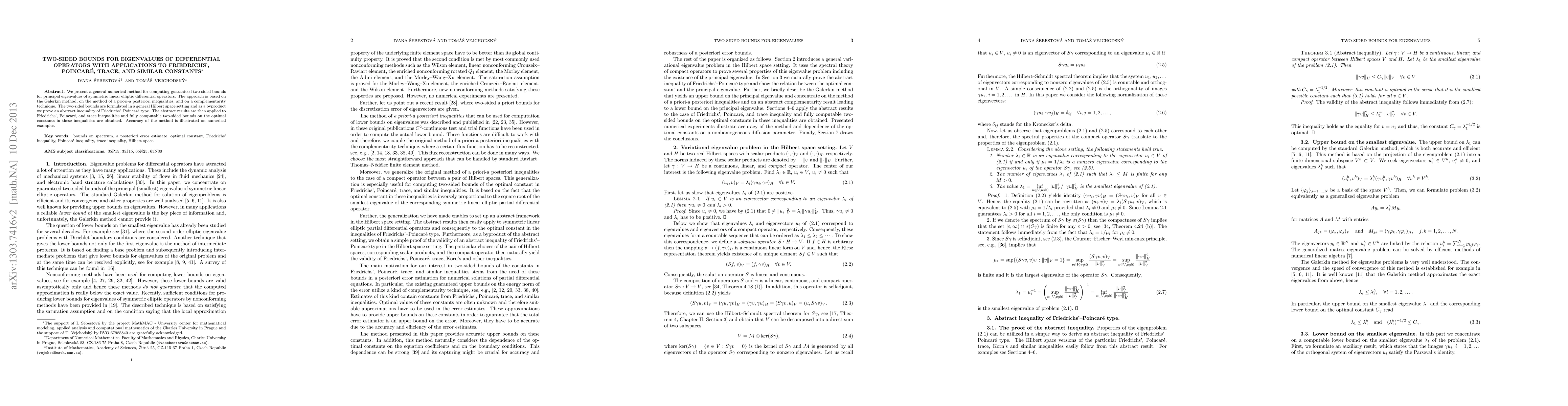 This paper develops a numerical method to compute guaranteed two-sided bounds for principal eigenvalues of elliptic differential operators using Galerkin, a priori-a posteriori inequalities, and complementarity techniques. It derives optimal constants for Friedrichs', Poincaré, and trace inequalities in a general Hilbert space setting.